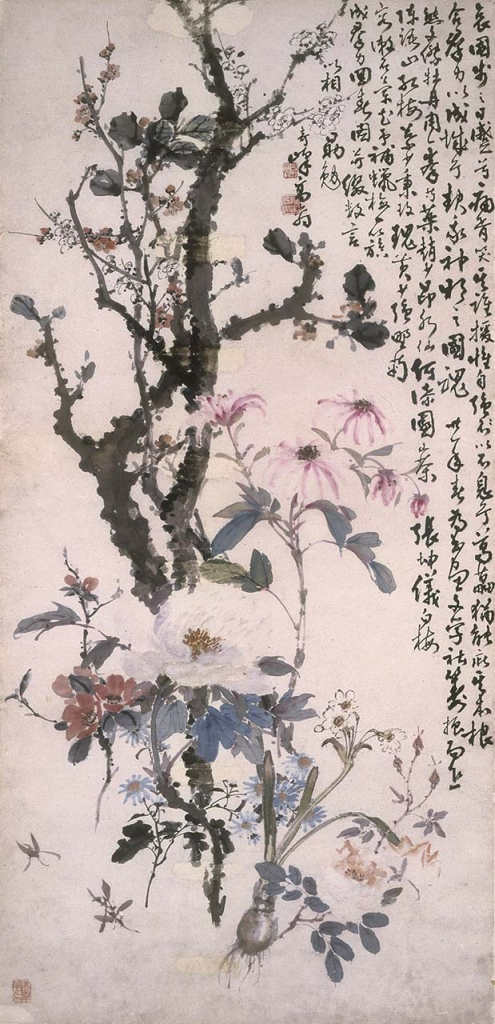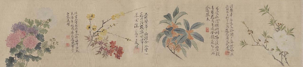 「國畫研究會」不乏出身書香門第,家學淵源者,他們浸淫於傳統,畫學根底深厚,以臨寫古人名蹟為習畫圭臬,摹仿畫作往往逼肖像真、絲毫不差,亦因此一直為折衷派所詬病。溫其球(1862-1941)以山水鳴世,亦工花鳥,尤對惲壽平的沒骨花卉鍾情不已,曾肆力搜求惲氏名蹟,觀摩臨習。展出的〈花卉卷〉(圖10)正是溫氏銳意摹寫12組惲壽平的花卉作品,起首四段的桃花、桂花、臘梅和菊花便以《山水花卉冊》的四頁惲氏花卉(圖11)為母本直接臨摹,連同題詩的部分亦完全依原蹟仿寫。兩者互見對照下,不難發現溫其球的臨仿作品與惲壽平的原作在細節的處理上並不完全一致。如首段的桃花,溫氏只施以素淡的白粉畫花瓣,而略去了惲氏原作的洋紅染邊;桂花的枝葉亦由原作的墨青改為紅綠「撞水」相混。由此可見,溫氏臨仿古畫,意不在複製原作,反而加入個人調整,在賦色上更是自有主張,相對原作進一步追求鮮妍明麗的風格,面貌更加接近當時大行其道的居派花卉。