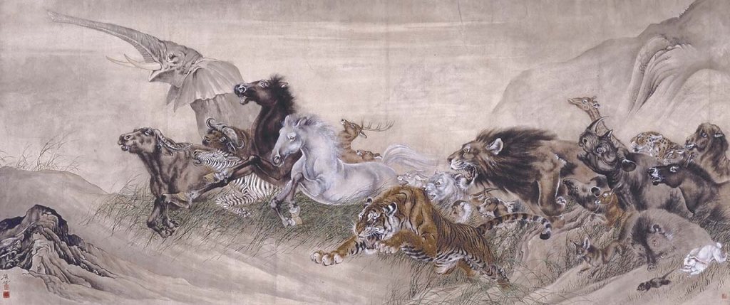 20世紀初中國政局飄搖,又逢外敵進犯,正陷於內憂外患的動蕩歲月。高劍父早年主張「藝術救國」作為其政治抱負的延伸,「嶺南畫派」肩負起救亡圖存的時代重任,積極投身社會題材的創作,將知識分子的憂患意識宣之丹青。胡藻斌(1897-1942)的〈義無反顧〉(圖12)據占展場當眼處,為其晚年扶病完成的遺作。胡氏以畫虎馳譽藝壇,早年曾投筆從戎,退役歸粵後專志繪畫。至日軍侵華,胡氏迫於戰火,南逃香港。及香港淪陷,胡氏不幸被擒,仍誓死不屈,拒絕投附敵人。畫中各種走獸,不論獅、虎、犀、象;還是狐、兔、麋、鼠,皆向前奔撲,或昂首、或奔騰、或嘶鳴、或怒吼,一致同仇敵愾,氣氛迫人。時值國族危急存亡之秋,胡氏以猛獸寄託其視死如歸的赤膽丹心,為報家國當義無反顧,籲人民當猛醒振作,喚發民族鬥志。