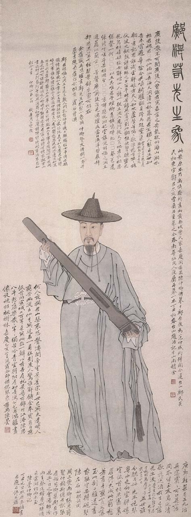 清代思想家顧炎武(1613-1682)曾提出「亡國」、「亡天下」之別,前者只為政權之更迭,後者卻是人性文明的淪亡。面對干戈紛擾的世道人心,應知保天下,然後知保其國。相比起折衷派的奮起疾呼,傳統派畫家在動盪的時局裡始終堅持對丹青的追求,透過推崇古聖前賢的精神修養,表現對修身處世的擇善固執,折射出傳統士人「修身、齊家、治國、平天下」的民族大義。〈鄺露像〉(圖13)原由清代畫家禹之鼎(1647-1716)所畫,趙浩公(1881-1948)先後兩次受託臨摹此畫,不單是對筆墨技巧的追仿,更是對古人理想人格的企求。鄺露(1604-1650)是明朝末年的廣東名士,清兵入關南下之際,鄺露死守廣州城,力抗清兵達十個多月,廣州最終兵臨城下。鄺露拒絕投降,並返回居所,將平生珍藏的古代文物及書畫放於左右,從容就義。據說鄺露殉節時手抱最為鍾愛的「綠綺臺」名琴,而「鄺露抱琴」亦成為了文人風骨耿直的遺民象徵。展覽同步展出了「綠綺臺」原琴拓本,與〈鄺露像〉同列,尤有點睛之效。