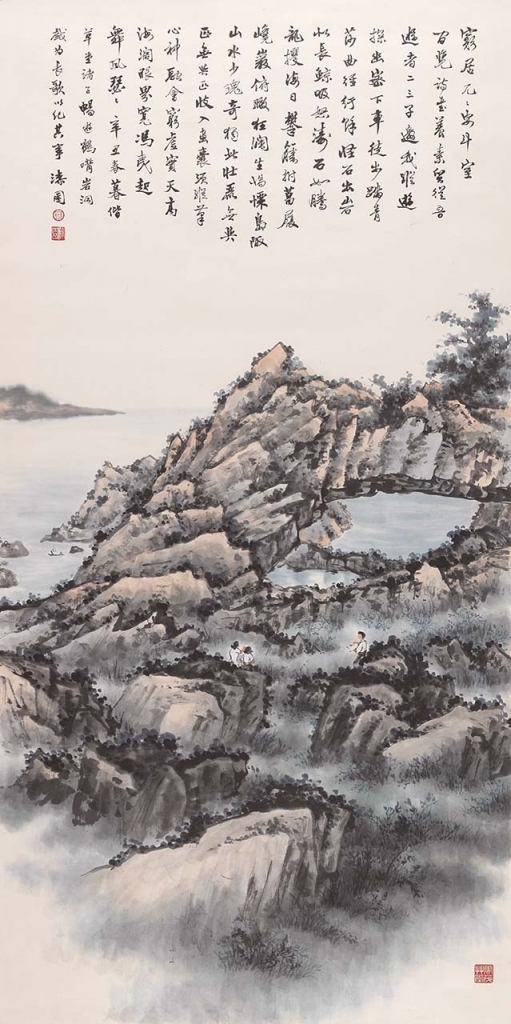 何漆園(1899-1970)、趙少昂(1905-1998)同為高奇峰的學生,二人來港後亦秉承師輩的步伐,積極授徒教學,桃李滿門。何漆園〈鶴咀幽岩〉(圖15)為其與學生暢遊赤柱鶴咀蟹洞寫生所作,何氏著力表現嶙峋的石理,運用西洋畫透視法與光影原理彰顯洞巖斷岸的奇觀;趙少昂自1940年代移居香港後,到處寫生不斷,其〈沙田望夫山〉(圖16)便是一例。他以富變化的墨色表現煙雲樹石的遠近層次,將山麓的寮屋、山崗的望夫石以及背峰的獅子山一併呈現在縱深的山水構圖中,紀錄了昔日沙田的滄海桑田。其他南寓畫家如彭襲明(1908-2002)、林建同(1911-1994)、呂壽琨(1919-1975)等亦挾藝遊港,積極在香港留下山水足印,視之為安身立命的棲居之所,表現出「居於斯、樂於斯」的地方情懷。香港獨特的文化環境為廣東畫家提供長足的發展空間,使新舊思潮得以在這片「南中之南」的土地上滋養,為香港早期繪畫發展埋下了萌芽的種子。