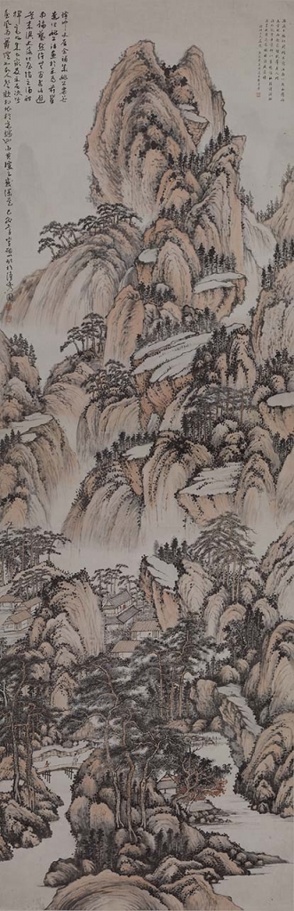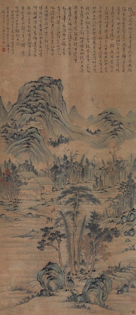 展覽入口不遠處展出了清代黎簡(1747-1799)晚年所繪的巨幅〈山水〉(圖2),當中河岸式構圖,以至疏樹草亭的布局,明顯出自明代倪瓚(1301-1374)的風格。凡仿倪雲林者,必從疏淡枯禿一路,以表現淡泊蕭條的空寂,唯黎簡此作大膽以濕筆代乾筆,突出淋漓蒼潤的南方山水,尤見石濤影響。畫中的披麻皴、苔點及礬頭處理亦有五代董源、巨然之致,點景人物的加入更與倪瓚不染塵俗的畫癖背道而馳,黎氏此作可謂集百家之大成而參入己意。