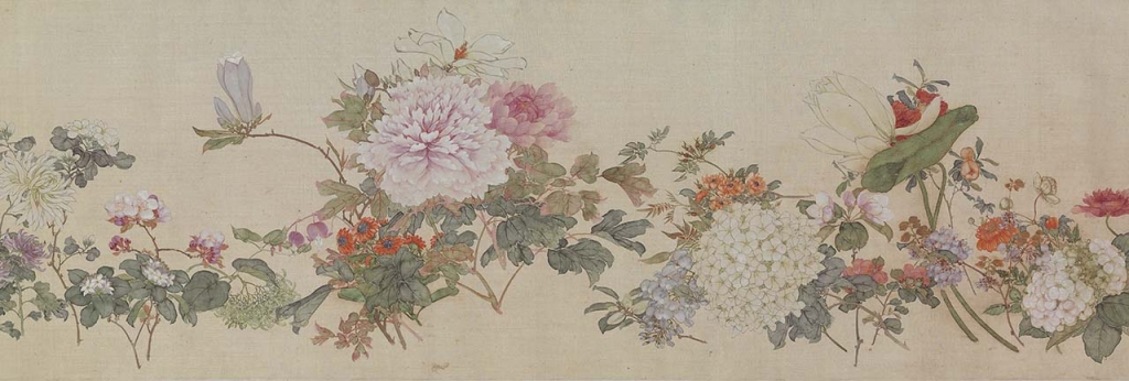 居廉的〈百花圖〉卷(圖6)是其傳世精品之一,全卷構圖豐富,各式折枝花卉交錯其中,撇開雙勾廓填的院體樣式,直接賦色敷染,巧妙將嶺南水氣氤氳的鄉土環境與古典沒骨花卉結合。居氏作畫擅於寫生,師法自然,曾遍搜各種花卉草蟲,對花寫照,尤能細察秋毫,筆下的花葉形態極為細膩。此外,展覽更精心為居廉〈百花圖〉標柱花卉名目,輔以植物學資訊輯成一部「花卉圖鑑」,於作品旁設置電子屏幕裝置,觀眾能夠細閱〈百花圖〉及香港常見花卉的詳細資料,方便識辨嶺南四時花卉的千姿百態。