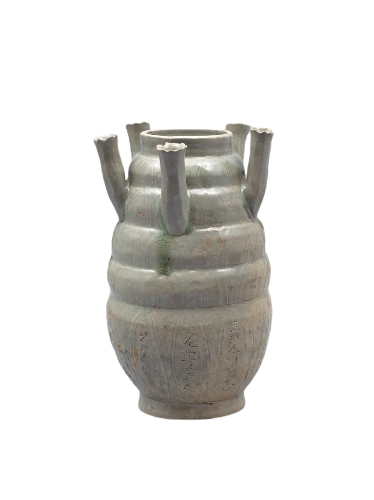 進入秦漢時代之後,青銅器漸趨沒落,漆器和陶瓷之製作則開始增加。此時雖然也有許多仿青銅器的器形,但商周青銅器所具有的莊嚴氛圍卻已逐漸淡去,而其圖像和紋樣也開始出現「昇向仙界成為不老不死仙人」的昇仙思想。此後,酒一直被視為人們與神或祖先之間的媒介,北宋〈青瓷多嘴壺〉(圖2)上的銘文即寫道:「元豐三年又九月十五圓日,增添福壽,鬯且之進與何十二婆,百年後應益安,孫子富貴,長命大吉。」由此可知當時獻鬯祭祖來祈求子孫安寧。東漢許慎所著字書《說文解字》「鬯」條目中提到鬯的芬芳香氣可以降神,因此一般認為多嘴壺的特殊器型是為了讓鬯的香氣充滿墓室,常保馨香。