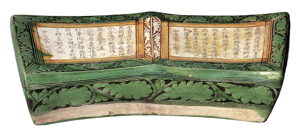 唐代以後,除了長沙窯和磁州窯系,明末以陶瓷製成的酒器也會寫上很多吉祥話和詩文。〈三彩詩文枕〉(圖3)仿照書冊攤開的造型,其上刻有配以北宋時期〈七娘子〉曲調所吟詠的詞句。詞句中,男女互相吟詠、想念著情已逝的戀人,而男人似乎想藉醉酒來排遣消沉的心情,前往夢中的世界。歌詞中所出現的枕,暗示著戀人們的蜜月,並引人走向醉中所見的虛幻夢境。此瓷枕正是反映了歌曲內容的流行造型。