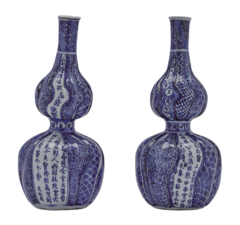 明末時,反映日本茶人喜好、於景德鎮民窯燒製而後進口的青花瓷器,在日本被稱為「古染付」或「祥瑞」,以採用幾何紋樣之設計為特色。這些器物上,融入了源自中國經典或戲曲歌詞的詩文字句,這些文詞的設計亦相當賞心悅目。以下這段摘錄自唐代詩文的句子,常被寫在〈青花捻文瓢形德利〉(圖4)之類的祥瑞酒器上,想來在民間受到喜愛並廣為流傳:「酒是人間祿,神仙祖代留。三杯和萬事,一醉解千愁。」詩中吟詠著酒可使人忘卻煩愁,但已深入世俗人間的酒,仍被視為神與人之間的連結紐帶。中國的陶工是否認為,借酒澆愁、茫醉吟詩的樣子,在日本也很常見,所以把它寫在即將輸往日本的器物上呢?