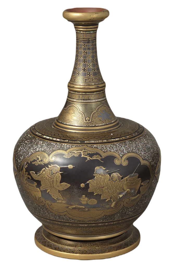 右:圖6 日本江戶時代17世紀前半〈故事人物蒔繪螺鈿瓶子〉,高21.8公分,口徑4公分,腹徑13.7公分,國立歷史民俗博物館藏。(圖/大和文華館)