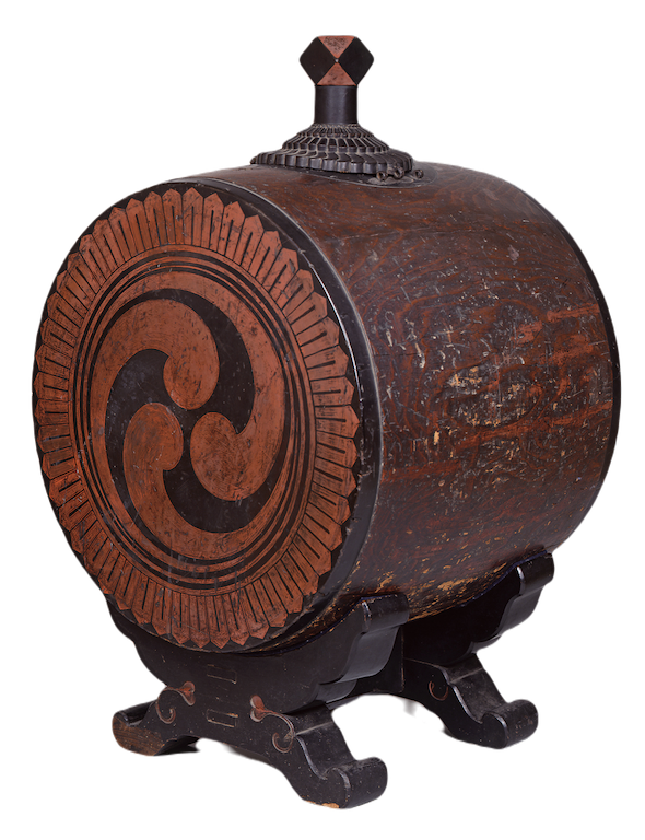 鑑於飲酒造成的弊害,佛教禁止賣酒或飲酒。但在人們對富裕生活的憧憬中,酒卻是必不可少的。〈光明真言功德繪詞〉(圖7)以詞句和圖畫表現了念誦光明真言此一密宗真言之功德。念誦此真言的功德,據說可以消除一切罪孽,獲得福樂,而畫中為了表現作為「福德」的現世利益,就描繪出飲食豐足的生活和酒宴的情景。另外,仿太鼓造型的酒樽〈漆塗太鼓形酒筒〉(圖8),則是僧侶們捐獻給神宮寺這座神社的物品,由此可以窺見當時僧侶與酒的關係,以及在「神佛習合」的觀念下,寺院與神社深厚的關係。中世紀以名酒著稱的河內長野之天野酒,即是僧侶在寺院中所釀造的「僧坊酒」之代表,其高超的釀造技術,在釀酒技術和產業化的歷史上都具有重要的意義。日本的神或佛與酒之間的關係,亦可謂源遠流長。