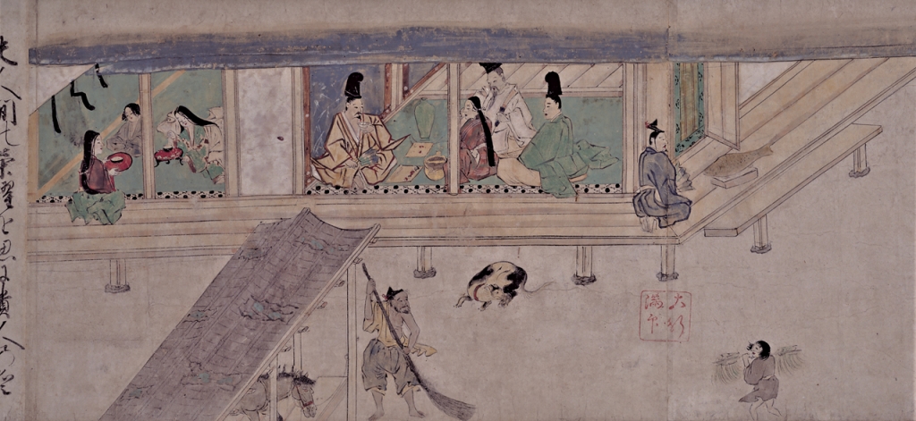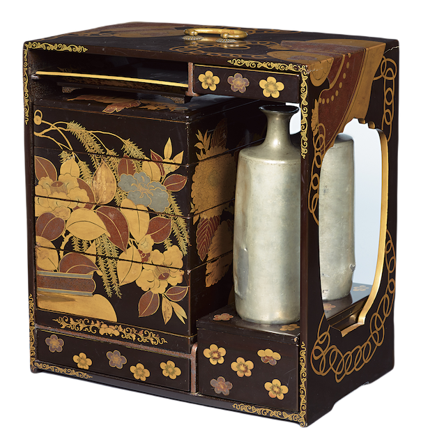同席共食,是為了將人與人連結起來,加深彼此的關係。在人群聚集的宴會桌席間提供酒水,亦具有連結人際的作用。〈蒔繪椿紫陽花文提重〉(圖9)附有把手並配套一整組餐具,方便隨身攜帶至賞花或遊山等戶外酒宴上,其表面以金銀蒔繪和金貝技法描繪出巨大的山茶花和紫陽花。飲酒之風俗,不論是在賞花、賞月等時令宴會上,或是為家人親朋所設宴席上,既是享受季節的恩賜,也強化人與人之間的連結,至今仍根植於人們的生活當中。