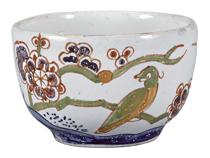 盃(杯),源於「酒坏(さかづき)」,古代日本用的是陶器,中世以後用的是漆器,江戶時代中期則開始使用瓷器。杯的種類繁多,由材質區分,有陶瓷器、漆器、金屬器、玻璃器皿等,尤其在陶瓷器中可以看到各種精心製作的杯。朝鮮王朝時代的粉青杯,以及深受日本茶人青睞的可愛荷蘭陶器〈色繪花鳥文杯〉(圖11)等杯器上,融合了色彩、形狀、質地、繪畫等鑑賞要素。此外,荷蘭東印度公司也將荷蘭的陶器和玻璃葡萄酒杯帶到了日本。