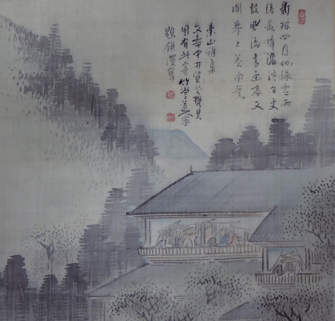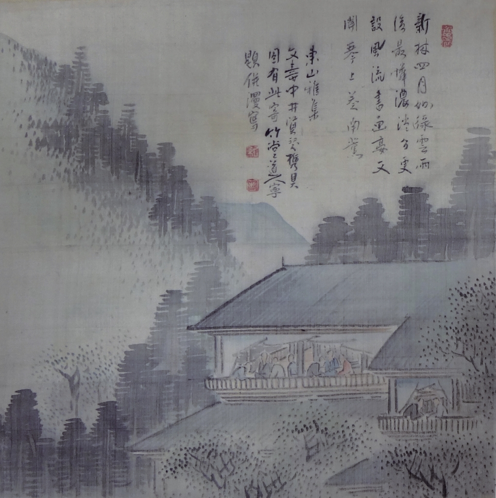 日本的文人和畫家中,亦多愛酒之士;位於京都東山的三層酒樓「端之寮」(又名「東山第一樓」)即是圓山應舉(1733-1795)等文化界人士聚集的場所。《東山第一樓勝會圖畫帖》彙集17名書家和31名畫家於寬政十一年(1799)4月6日聚會後創作的書畫作品,其中一幅(圖10)便描繪了眾多文人聚集在「東山第一樓」最上層俯瞰京都的場面──大概是在此文人雅集之處,一邊欣賞風景,一邊享用酒菜吧。江戶時代後期,古染付或祥瑞等中國明末的青花瓷器已傳入日本,作為茶具或懷石用具使用,並有青木木米、奧田穎川等陶工仿作中國瓷器的複製品。可想而知,這些關注著中國文化或外來文化的文人們,聚會中所使用的都是各種獨具風情的酒器和食器。可見美術作品中展現了各種酒宴的場景。