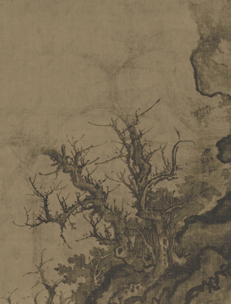畫面上所有的寒林蟹爪與墨葉,都是經由增減推敲再確定,最後留在畫面上的濃墨與細節幾乎毫無廢筆。為了整體的豐潤感,他捨棄已經冒出山頭渲淡的蟹爪,以直接勾勒濃墨的枝幹,讓左方兩棵寒林倏然而斷(圖10),顯得大膽而精準。但郭熙的繪畫技法也並非完美無缺,事實上〈早春圖〉裡有極少數可以被辨識出來的修改,比如主景雙松左下水面,那一株橫出的墨樹(圖11),原先該終止於水岸邊,非常可能是郭熙在整體完成後,礙於兩道水口過於相似,遂添枝幹以延伸。