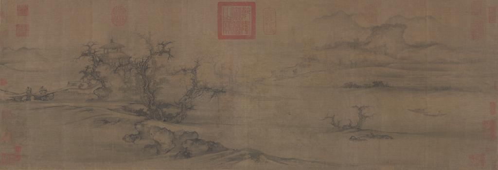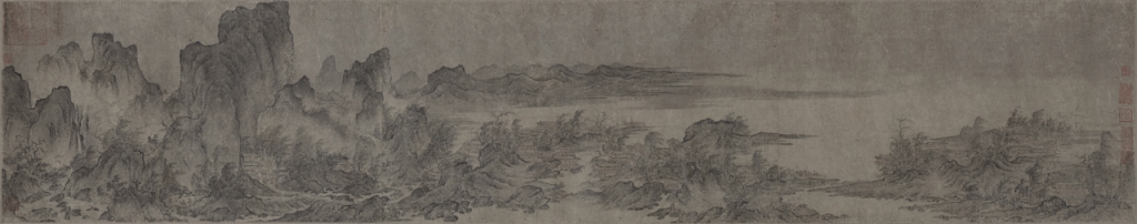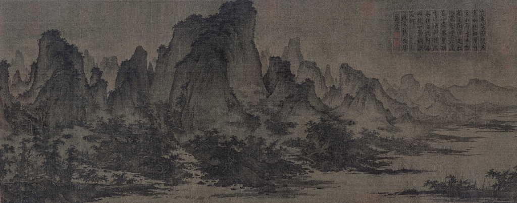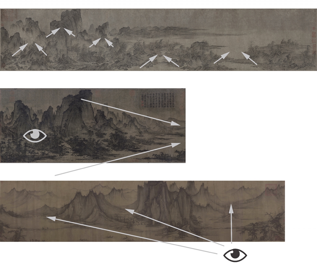 針對這三件手卷畫,學者方聞曾有專著(見《夏山圖》、《宋元繪畫》)述及畫家們對於山勢前後起伏的立體感,與群巒層層延伸的布局能力,以及如何讓畫幅在起伏有致的重峰萬壑與空間緜延,隨著主山相連、由高而低、自前而後逐漸隱退。方聞認為,諸家筆墨從細膩複雜、躁動不安,逐漸傾於溫潤愉悅,技巧上也從勾勒、皴擦、層層渲染的循序,逐漸發展出勾皴同時摻以水筆渲淡的意趣。這種描述大氣氤氳的繪畫技巧,大約在北宋中期才逐漸成熟。