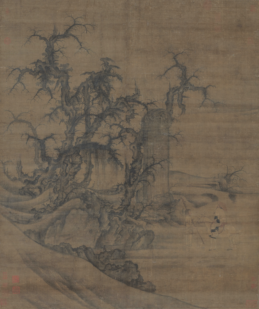 不過,觀察〈窠石平遠圖〉蟹爪枝枒的慣性與筆墨明確所散發的簡潔明亮,其意境或空氣處理手法,皆與〈讀碑窠石圖〉氣質迥異。〈讀碑窠石圖〉用筆較鈍重質樸,這種鈍重源自於細膩的疊染之後,覆蓋掉原有線條所產生的模糊混沌,在節理扭轉的凹洞與樹形之間,可發現藏有不少筆尖處理的細節,諸如龜裂的紋理、細小的樹枝與蔓生的植物。在樹法上,前景互為交疊的枝幹、樣態不一的造型,或蛀空糾結的擠壓,或俯仰橫生的差異,很接近自然寫生的現實感,與些許雜亂卻不至於重複序列的原創感,因此在枝幹或根部前後交接上,往往面臨一些沾黏不分的情形,比如蟹爪枝椏自左右前後岔出,所造成彼此盤錯糾結的立體感。畫面最左的兩棵樹,分別採淡筆與截斷隱沒的方式,這些細節也可以在郭熙〈早春圖〉上看到極為相似的延續傳承。