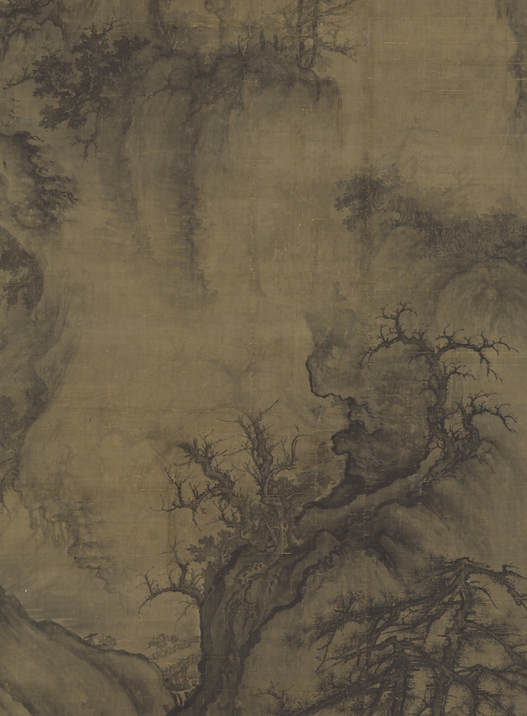 《林泉高致》又云:「山欲高,盡出之則不高,煙霞鎖其腰,則高矣。水欲遠,盡出之則不遠,掩映斷其派,則遠矣。」這無疑是畫家面對真實具體的世界,思考如何以煙霞、掩映的藝術手法,對於山勢、遠近進行大氣透視的闡釋。事實上,〈早春圖〉的動勢,正是立基於「虛」所形成的。為了符合冬去春來的氤氳蒸騰,整體布局在穩定中幻化迷濛,畫家必須在主體明確的狀況之下進行消融,也可能在一團迷離中逐步確認形體。畫面中的山勢實際是重心垂直聳立的丘壑,隨著視點逐漸升高,前景中段扭動的山體,看似與主峰有渺遠的距離,實際峰頂林木映蔽,早以淡墨區分前後,與左上的崖體相去不遠。順著橋面上文士與二位僕從的導引,進入前後之間的U型山溝(圖9),緩步而上的兩位旅人分別肩挑貨物、拄杖而行,奮力往樓閣前進。郭熙一開始用極淡的墨色,將山體前後分得清清楚楚,但顯然這可能斷裂整體動勢的連貫,是什麼原因讓他在最後捨棄原來在畫面上極淡的山巒與雜樹,而決定不再加深?這些極淡的痕跡,明確保留在畫幅中段的煙嵐之間,裡頭隱藏了很多似是而非的追索,與幽然心靈意造的昇華。