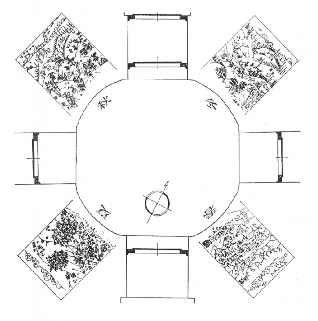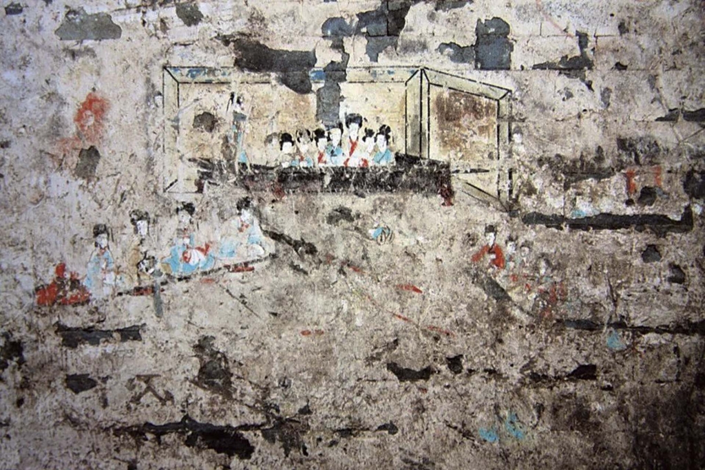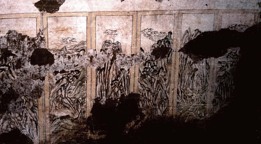 中國最早的畫屏文獻肇始於周代,千年來隨著功能需求與材料的差異,傳世畫屏幾乎難見全貌。而墓葬壁畫中,從西漢晚期墓壁〈觀舞圖〉(圖2)中的人物推測,或許當時已有長寬大於2×11公尺的L型屏風(以七人並肩至少3.5公尺計,惟需容許西漢墓室畫工在畫藝上對實際比例的誤差),且畫屏四邊包覆寬邊的織品、框架保護。唐代李道堅墓(738)西壁上有六幅(以下或稱曲、屏、扇)屏風壁畫(圖3),畫屏之間亦繪有邊框,此六幅水墨山水的特色是山巒起伏、各不相連,而非日後發展連貫的通景山水形式。唐《歷代名畫記》記載張璪(活動於780-804)「曾令畫八幅山水障」與「松石障」。而唐代翰林學士院在唐憲宗時期(805-820)也有〈海曲龍王圖〉、〈松鶴圖〉等障壁畫的記載。至於建於遼代聖宗後三朝(約983-1030)的慶陵東陵,其中室的四面分作春、夏、秋、冬四季壁畫(圖4),實際每幅長寬為5×4公尺,描繪契丹民族在北方草原游獵、捺鉢的生活狀態。由於不同朝代、族群的更迭,加上粉壁與絹本、宮廷與陵墓、屏風與障壁畫、典制道統與皇室品味之間的差異,以及繪畫題材為不同空間、目的、需求、流行服務的功能性等,大大複雜化了這類創作題材的表現形式。