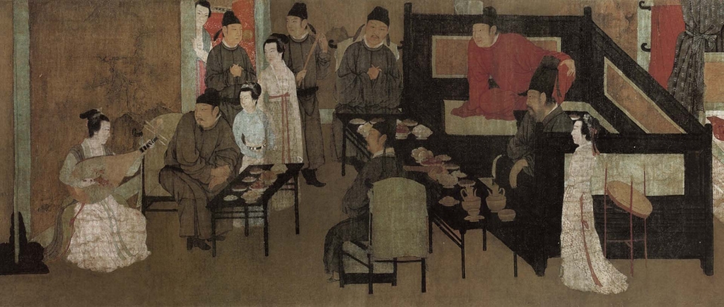 隨著宋神宗在元豐六年(1083)進行學士院玉堂(正廳)的改修,上述壁畫恐皆損毀軼失。但北宋蘇軾見證了被重新更換上的郭熙〈春江曉景圖屏風〉(1083,尺寸不明,推測亦約3×6公尺),並寫下「玉堂畫掩春日閒,中有郭公畫春山。鳴鳩乳燕初睡起,白波青嶂非人間」的詩作。而蘇轍在〈書郭熙橫卷〉(1086)詩中,還提到郭熙另一件照壁山水畫屏,稱之為「鳳閣鸞臺十二屏」,上頭畫有崩崖斷壑、枯松野葛等主題。鳳閣、鸞臺是唐代中書、門下省的別稱,此作推估最大尺幅,是四扇屏風形式、採三組件置放於四根柱子之間,總長寬可能為3.7×18公尺的樹石屏風。唐、五代以來,照壁、屏風產生各種形式,如單扇的「截間屏風」(即隔屏)、雙屏、三疊屏(可參考五代畫作如王齊翰〈勘書圖〉、周文矩〈重屏會棋圖〉、顧閎中〈韓熙載夜宴圖〉(圖5)等)、可開闔的「多扇屏風」等。據小川裕充推測,隨著北宋政治的瓦解,這些障壁畫恐怕在靖康之變後,就被攜往北方了。