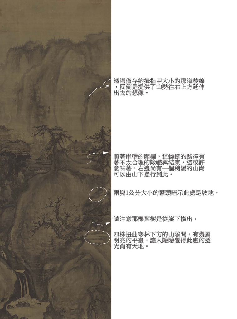 倘若自矗直的雙松往亭子退行,順著崖壁的圍欄,這蜿蜒的路徑有著不太合理的險巇與結束,這或許意味著,右邊尚有一個稍緩的山崗可由山下登行到此,否則那片曖昧不明的白,大可信筆抹暗。至於崖壁下緣的空間也難以解讀,按理當畫面預計在邊際結束,畫家多半採取簡化細節,或相對暗深以淡化對比,以便畫面可以聚焦在更中間的主題。我們注意有一棵葉樹是從崖下橫出,兩塊1公分大小的礬頭暗示此處是坡地,四株扭曲寒林下方的山隙間,有幾層明亮的平臺,讓人隱隱覺得此處的透光尚有天地。