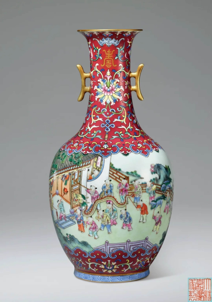 同日上拍的「紫宸窯韻─藝德堂藏明清瓷器」專場總成交率95%,總成交額3514萬港元。專場冠軍為清嘉慶《胭脂紅地粉彩嬰戲圖瓶》,胭脂紅地明豔,圖樣的嬰孩栩栩如生,神態各異,活潑可愛。上拍時便引發激烈的爭奪,價格隨之一路攀升,最終以516萬港元成交。第二名則為清乾隆仿掐絲琺瑯的《松石綠八吉祥紋瓶》,巧妙融合了瓷器工藝與掐絲琺瑯,線條流暢,刻劃細膩,呈現出強烈的皇家風範。