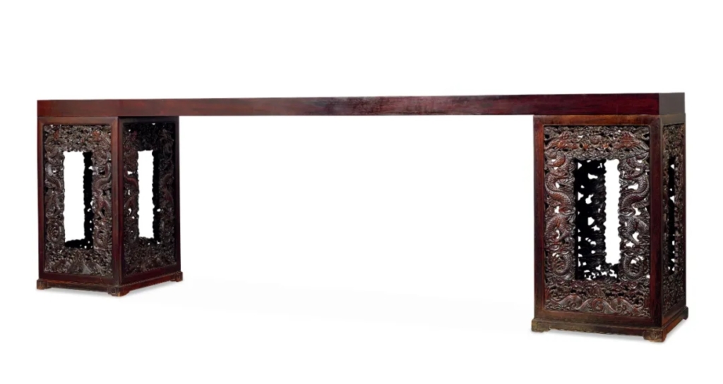 本季「觀古─瓷器珍玩工藝品」分作兩日上拍,總成交額為3687萬港元。「觀古─瓷器珍玩工藝品.雜項」專場中,各類藏品大放異彩,總成交額達到3687萬港元。「新加坡魯班莊藏明清古典傢俱精品」專題表現堪稱完美,實現了百分百成交,在專場中獨佔鰲頭。清乾隆《紫檀雲龍紋架几案》以其用料的奢華與工藝的極致考究,成為眾人矚目的焦點。在激烈的競拍中,它一路過關斬將,最終以396萬港元的高價成交,充分展現了其非凡的藝術價值與收藏魅力,印證了明清古典傢俱在收藏市場中的熱門地位。