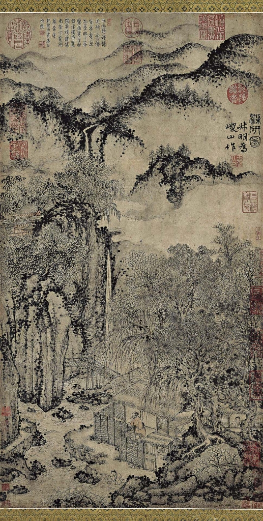 作品以層層疊疊的山影為遠景,襯托著如銀鍊般的白瀑,畫家以細密筆法描染林葉植被,樹叢掩映著臨溪茅屋,屋內隱者獨坐靜觀,命童子赴溪清洗硯臺,此舉亦是品名「滌硯」的緣由,清代《石渠寶笈》可見其畫名條目。畫上收藏印20餘枚,清代藏印便占15枚,除了《石渠寶笈》的鑑藏印「乾隆御覽之寶」、「石渠寶笈」、「乾隆鑑賞」、「宜子孫」、「三希堂精鑑璽」、「石渠定鑑」及「寶笈重編」,另鈐蓋「乾隆宸翰」、「太上皇帝」等,乾隆皇帝亦題詩:「臨池靜課餘,洗研命僮胥。應有魚吞墨,那無鵝換書。豈懷投卞璞,惟覺類莊樗。徒倚南榮下,窗開萬象虛。」