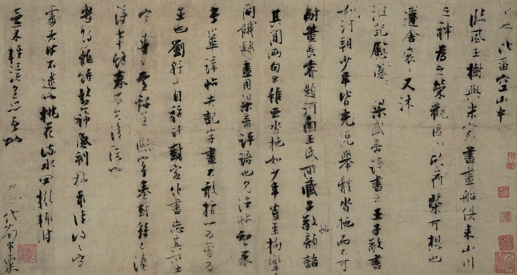張即之傳世書法作品稀少,其書法獲得市場關注的起始是2002年4月佳士得香港拍賣,以無底價方式競標《楷書大方廣佛華嚴經》,最終成交金額高達887萬港元,創當時中國書法作品拍賣世界紀錄。本件〈論書帖〉又名〈比留空山帖〉,應是張即之告官歸里後所書,是十分少見的行書手札,不同於宋人書信常見的尺寸,此件約二尺,內容以論法書鑑藏為主,援引梁武帝《評書》語、黃伯思〈題河南王氏所藏子敬帖〉韻語等觀點,可見張即之的淵博學問,其中亦參雜「籠餅」、「鹽柿」等通俗用語,也展露出當時宋代士人交際的樣態。通篇用行楷書寫就,與其常見的抄經書法相比更為靈動,結組的變化更為活潑。根據鑑藏印「宋犖」、「項士傑印」、「長萬氏」、「長萬珍賞」、「張氏涵廬珍藏」及「五常鑑賞」推斷,〈論書帖〉曾由宋犖、項士傑、張文魁和張五常的收藏。