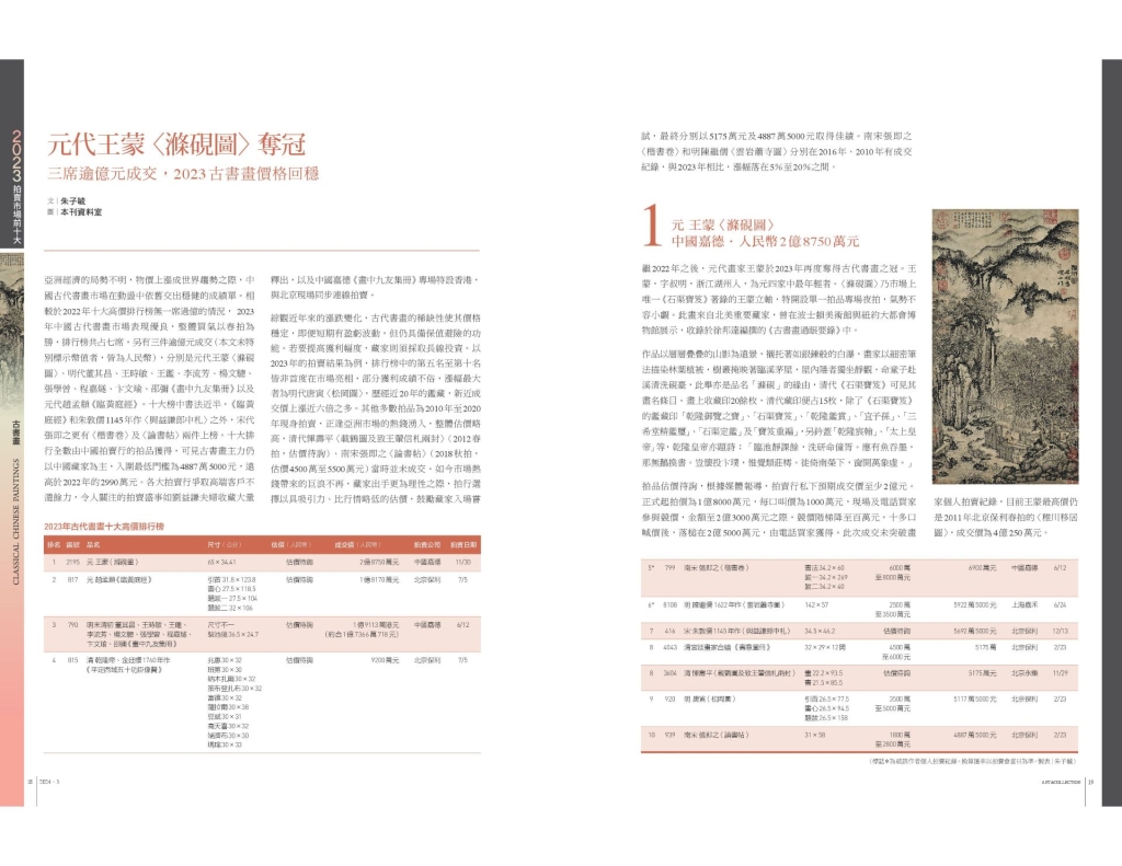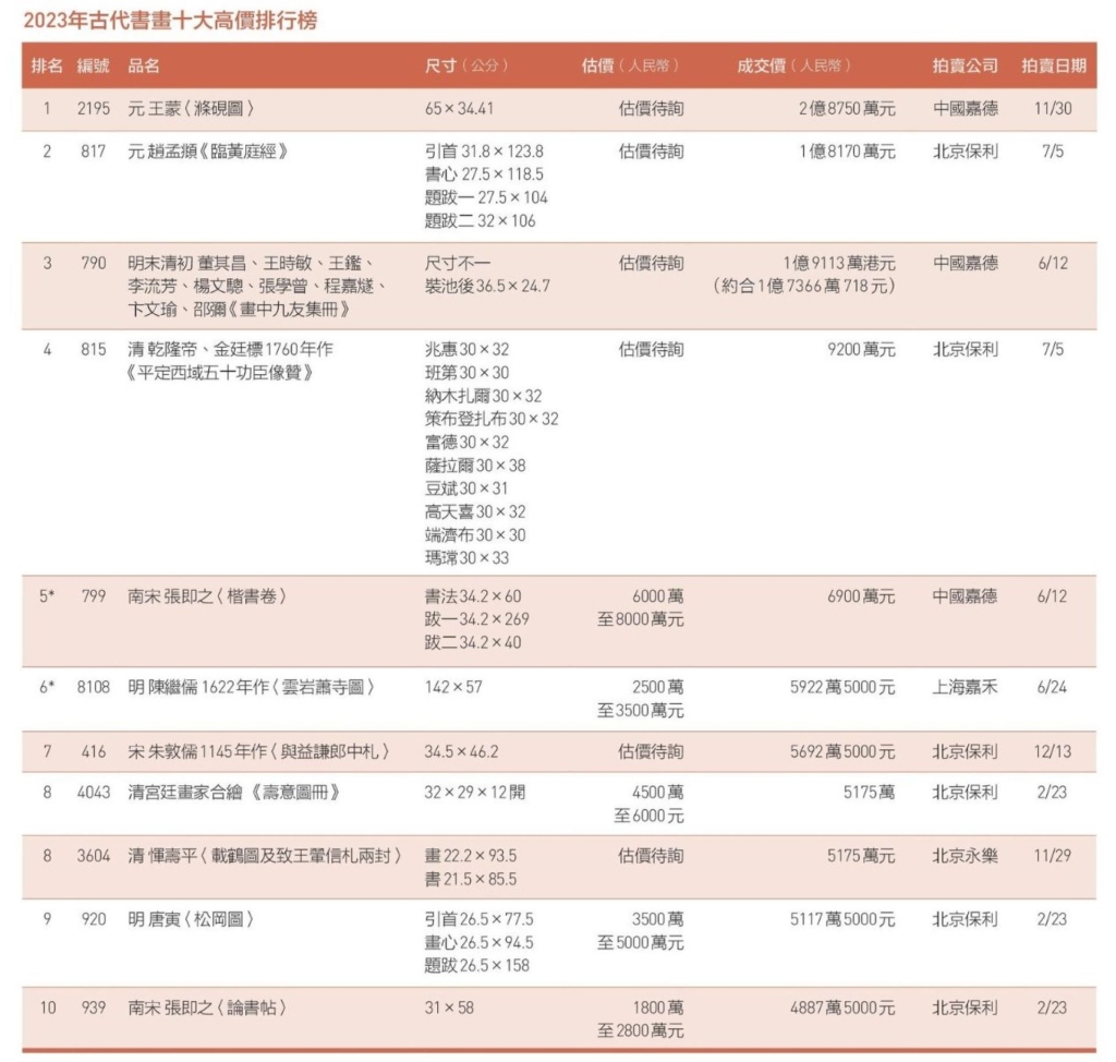 亞洲經濟的局勢不明,物價上漲成世界趨勢之際,中國古代書畫市場在動盪中依舊交出穩健的成績單。相較於2022年十大高價排行榜無一席過億的情況, 2023年中國古代書畫市場表現優良,整體買氣以春拍為勝,排行榜共占七席,另有三件逾億元成交(本文未特別標示幣值者,皆為人民幣),分別是元代王蒙〈滌硯圖〉、明代董其昌、王時敏、王鑑、李流芳、楊文驄、張學曾、程嘉燧、卞文瑜、邵彌《畫中九友集冊》以及元代趙孟頫《臨黃庭經》。十大榜中書法近半,《臨黃庭經》和朱敦儒1145年作〈與益謙郎中札〉之外,宋代張即之更有〈楷書卷〉及〈論書帖〉兩件上榜。十大排行全數由中國拍賣行的拍品獲得,可見古書畫主力仍以中國藏家為主,入圍最低門檻為4887萬5000元,遠高於2022年的2990萬元。各大拍賣行爭取高端客戶不遺餘力,令人關注的拍賣盛事如劉益謙夫婦收藏大量釋出,以及中國嘉德《畫中九友集冊》專場特設香港,與北京現場同步連線拍賣。