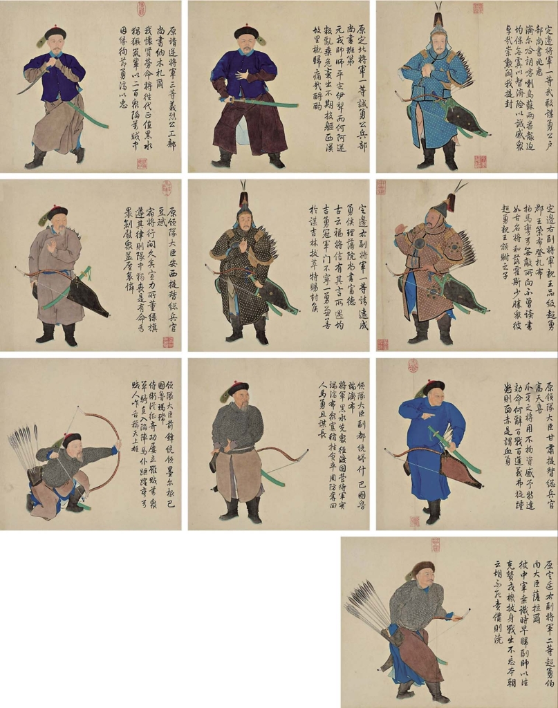 用畫像作為臣子功績的表彰,最早始於漢代,據傳漢宣帝曾將單于繪於麒麟閣,表彰他歸順之心。乾隆皇帝1755年出兵西域,平定準噶爾部及回部,軍隊班師回朝,皇帝設宴招待之外,命人為立功將士繪像,表彰他們的驍勇功勳。有別於中國的畫像傳統,《平定西域五十功臣像贊》的功臣面容栩栩如生,畫家細膩地捕捉到人臉的特徵,並且用明暗對比去形塑五官的立體感。然除了面容,功臣的身軀線條及戎裝造型則依循傳統的中國筆法,在衣紋勾勒上講究筆觸的提按勾勒,線條帶有書法的韻律趣味。雖然圖畫僅有金廷標署名,但從清宮存世繪畫及文獻記載來看,人物面容極有可能是另請西洋畫家圖繪,而從宮中檔案來看,當時領旨作畫的西洋畫家常是郎世寧。