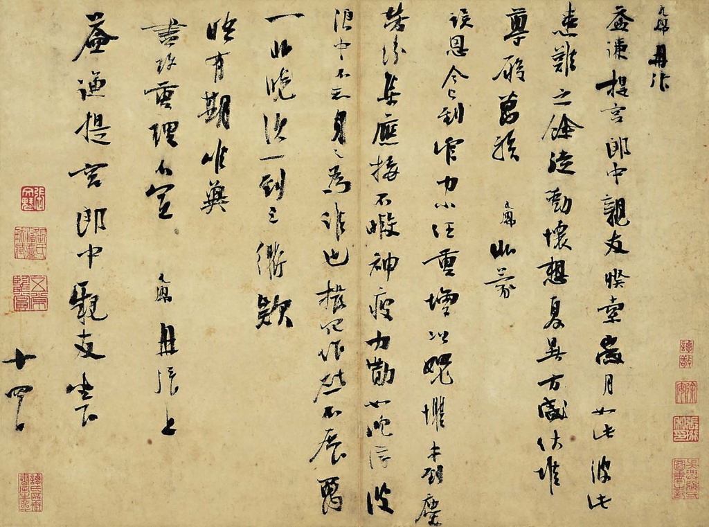 朱敦儒,字希真,洛陽人。他的一生橫跨兩宋,歷經過太平和戰爭之亂,詩詞婉麗清暢,南宋時期曾短暫入朝為官,高風亮節、不喜官爵的他最後選擇在野隱居,其詩詞書畫無不精通,時人評價「其字如其詩,其詩如其人」。如今朱敦儒傳世的書法罕見,小楷可見於東京國立博物館藏的定武蘭亭拓本題跋,行草墨蹟則僅三處可見,分別是國立故宮博物院〈塵勞帖〉、上海博物館藏〈瀟湘圖卷〉後的題跋,以及本次北京保利的〈與益謙郎中札〉。〈與益謙郎中札〉為朱敦儒寫給友人益謙的信件,一筆一畫具宋人風範,堅實墨重,是現今已知尺幅最大、字數最多的書法作品,又名〈暌索帖〉。