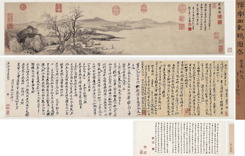 惲壽平,江蘇武進人。詩文為毘陵六逸之首,繪畫與清初四王及吳歷齊名,擅山水花卉。他與王翬交情甚篤,傳世多件題詠合作之作,如藏於上海博物館的王翬〈春山飛瀑圖〉上有惲壽平題。本件〈載鶴圖〉描繪水岸景色,淡墨暈染悠遠的山影,岸上山石以細皴飾之,呈現江南山水的柔美秀麗。船夫撐篙的小舟正在靠岸,舟上有白鶴停佇。圖畫右上角有王翬題跋,傳達對畫家的懷念之情。畫作與兩封致王翬信札一同裱成卷,而後成為清宮收藏,上有《石渠寶笈》七璽之外,亦見「嘉慶御覽之寶」、「宣統鑑賞」、「宣統御覽之寶」、「無逸齋精鑑璽」皇室藏印,收錄在乾隆朝《石渠寶笈》,《清宮陳設檔》、《溥儀賞溥傑皇宮中古籍及書畫目錄》。另有「虛齋至精之品」、「元濟恭藏」、「龐萊臣珍賞印」、「伯淵珍藏」、「吳郡孫氏圖書」等私人收藏印,為上海博物館退賠文物。