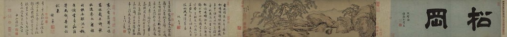 唐寅,字伯虎,直隸蘇州府吳縣人,吳中四才子之一,與沈周、文徵明、仇英為畫史上的明四家。〈松岡圖〉為唐寅42歲前的創作,畫作構圖布局疏朗,山石層疊環圍,與流水相襯更顯雄奇。九棵松樹矗立,松針用粗實韌勁的線條鈎成,松蔭下有一茅亭,亭中文士正展卷閱讀。以細筆乾墨勾勒,皴法用中鋒表現方折的線條,佐以層層皴染,淺絳渲青著色,呈現隱逸閒適的山水境界。引首「松岡」為文徵明隸書,根據畫中題跋及文獻資料,松岡應是當時金陵文士楊進卿的別號。楊進卿在蘇州有田產別業,每年秋季便赴蘇州,並與當地文人墨客交好,此作推測應為餽贈的「別號圖」。畫後有祝允明、王寵、謝承舉、湯珍四跋,鑑藏印有「蕉林書屋」、「雲松館靖侯珍秘璽」、「黃田村上八郎」、「如如居士之章」、「吳子深珍藏書畫之印」等30方,曾由梁清標、葉夢龍、韓榮光、蔣超伯、吳子深、朱靖侯、Frank Caro、戴福保遞藏。