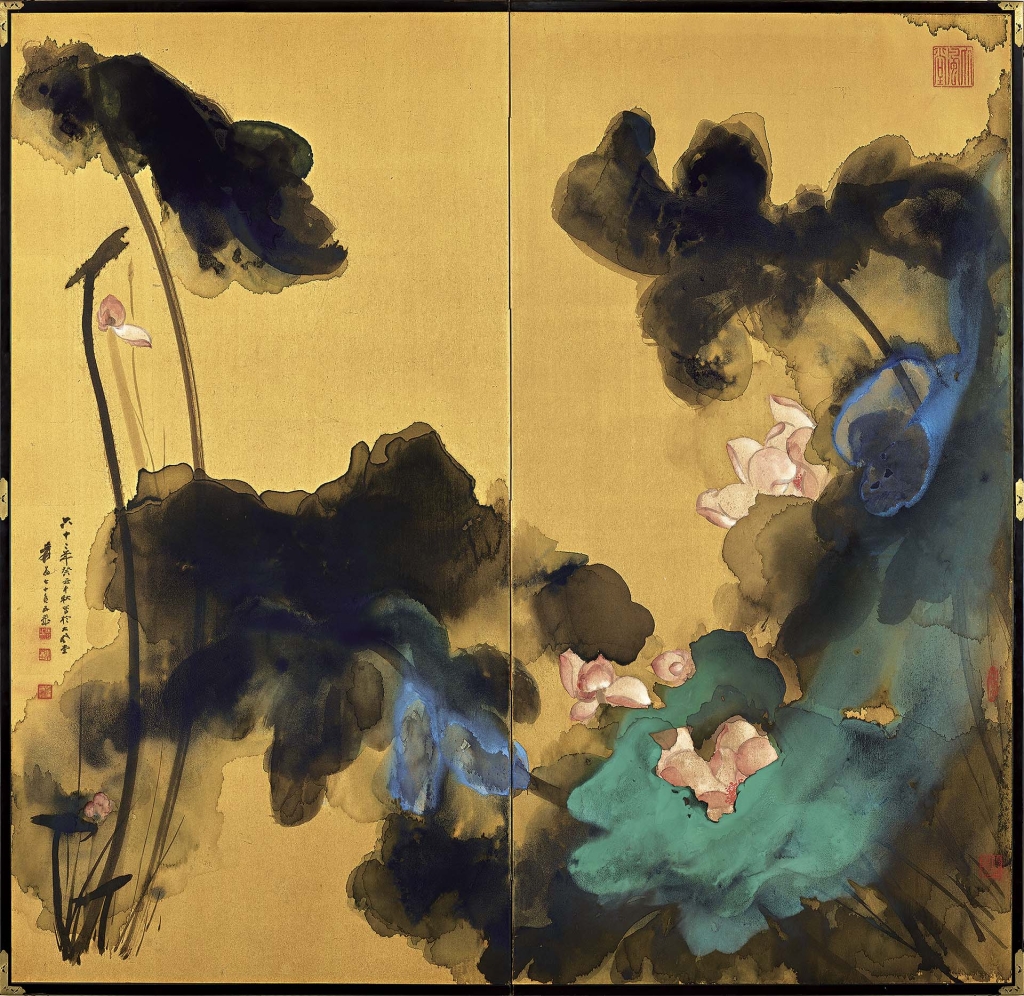 本件為潑彩金箋雙摺屏風。大千日本屏風之作屈指可數,目前僅知有六件,其中取金屏風且為潑彩風格,僅二件!其用料講究,金箔滿紙,珍貴非常,且別於尋常宣紙,控制色墨濃淡上更具難度。大千先以淡墨打底,復以濃墨積疊於上,大片荷葉頓現,復以礦物顏料石青、石綠潑灑,令色墨暈染一氣,入眼盡是一片氤氳淋漓。由畫上鈐「環蓽庵」印可知,大千此作完成於美國加州寓所,時屆七十五,然畫面仍張力滿盈,氣勢如虹;右下鈐「得心應手」印,自滿之情,不言而喻。本作源於陸菊森伉儷收藏,陸氏乃經李祖萊夫婦引介而直接向大千購得,後由陸氏家族遞藏,歷經半世紀神采依舊。