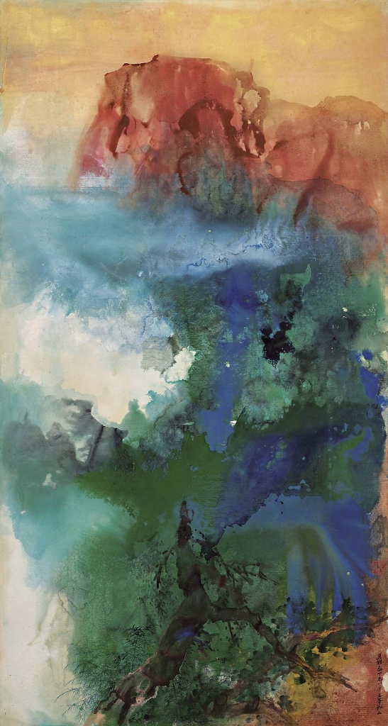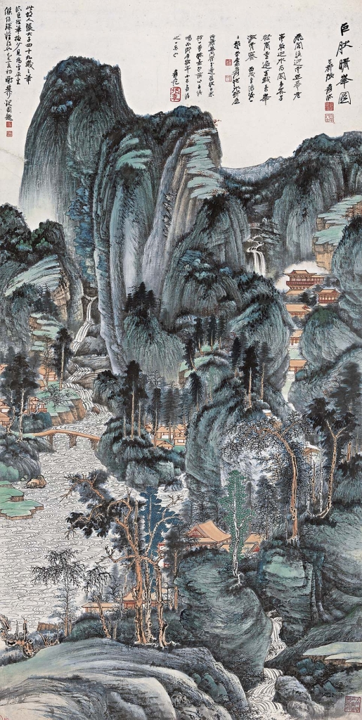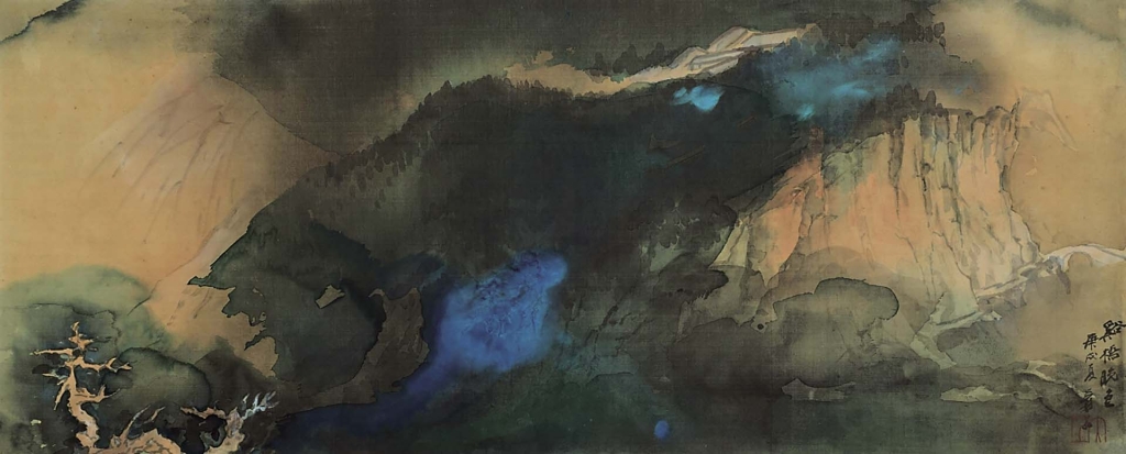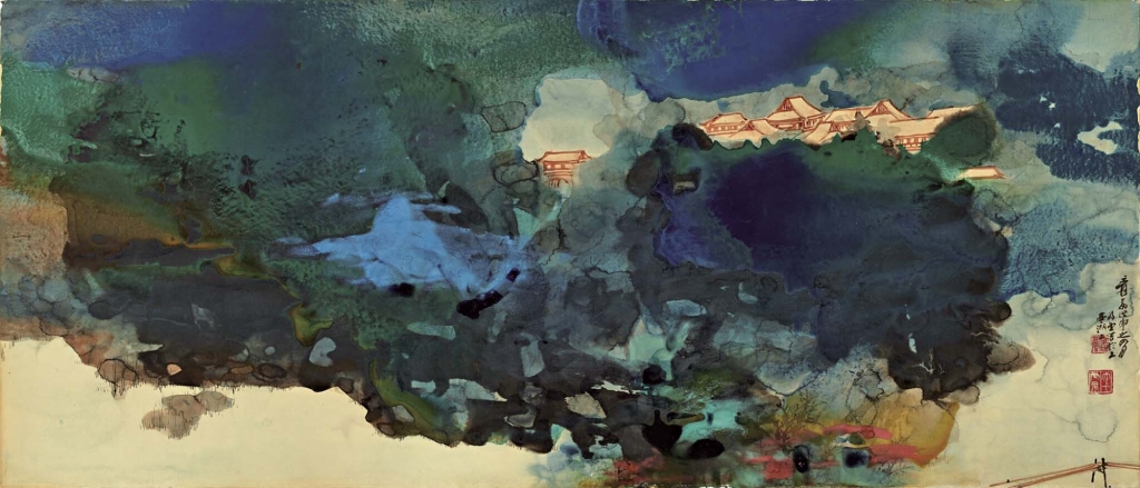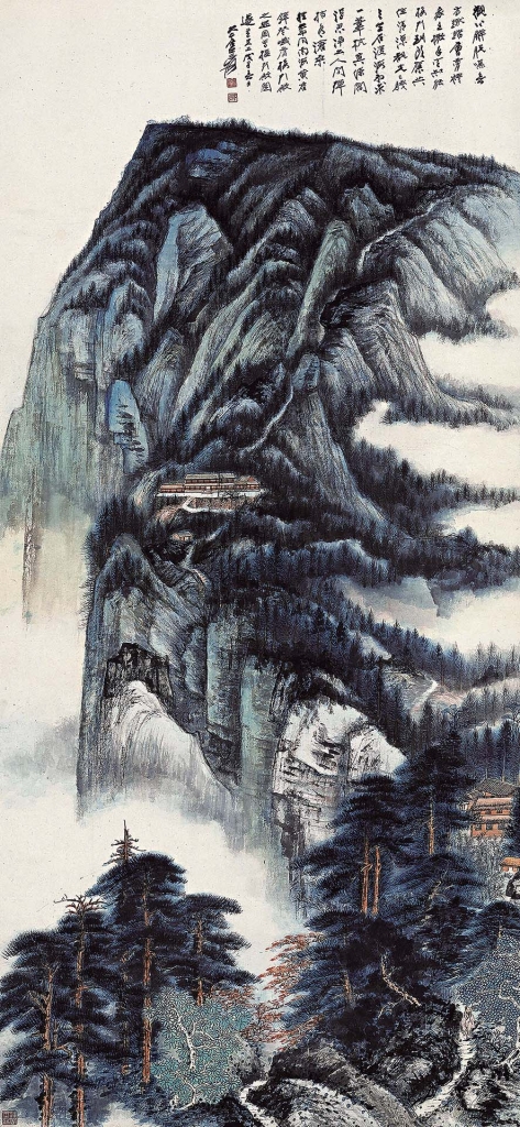本幅作於1970年,以潑彩為主,大塊石青、石綠形成強烈視覺衝擊,煙雲繚繞,撲朔迷離,具有很強的抽象意味;然其中亦輔以筆墨點景,山谷幽深,溪橋橫斜,洲渚淡遠,屋舍林立,樹木蔥蘢,直透一股清冽之氣,亦是傳統與創新融於一體。