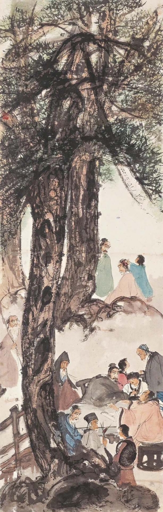 傅抱石此畫以「頂天立地」式的構圖將參天古松貫穿於畫幅,將畫面分裁,使空間層次分明,九位老者或伏案作書,或展卷觀畫,或沈吟賦詩,或相互交談,四位童子服侍其中。在形象塑造上,該作亦為傅氏人物畫中常見的鶴眼修長、雙眉入鬢之態,貌傲岸而氣高古,九老高逸出塵之態躍然紙上。高松與老者相呼應,表達出「高夀」寓意。該畫為傅抱石家屬舊藏,著錄出版累累,首次現身於拍賣市場,自人民幣3200萬元起拍,5500萬元落槌,成交價人民幣6325萬元。
