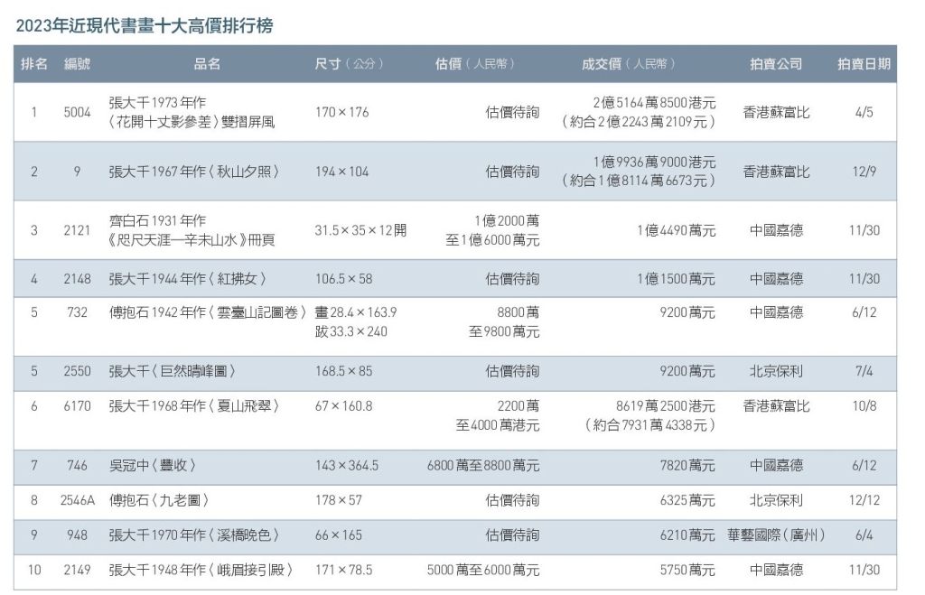 近現代書畫向來是古美術圈收藏群眾最大之版塊,隨著全球經濟及疫情影響之整體大環境,近年來進入價格修降調整期間,來源出處佳的超級生貨精品依舊獲得青睞,估價則成為買家拿捏入場競投意願的重要審慎指標。年度近現代十大高價相較於2022,整體成績拉升,四件億元拍品遠勝於一件億元拍品(2022年最高價為張大千〈仿王希孟〈千里江山圖〉成交價3億7049萬5000港元),第十高價亦由人民幣3000萬元拉升至5000萬元門檻,精品持續受到關注、價格回春的態勢明顯。