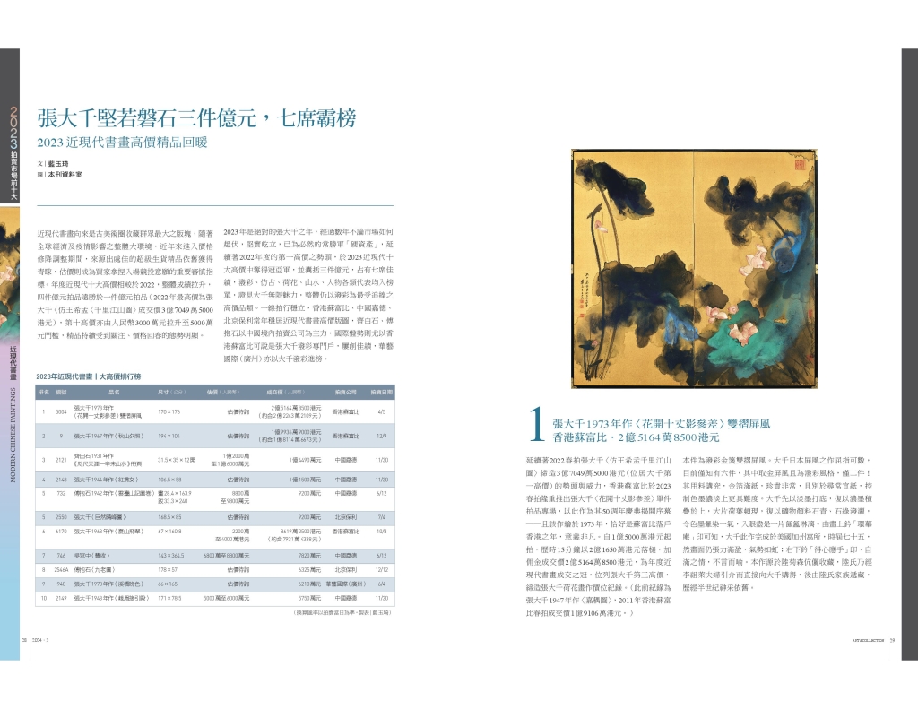 2023年是絕對的張大千之年,經過數年不論市場如何起伏,堅實屹立,已為必然的常勝軍「硬資產」,延續著2022年度的第一高價之勢頭,於2023近現代十大高價中奪得冠亞軍,並囊括三件億元,占有七席佳績,潑彩、仿古、荷花、山水、人物各類代表均入榜單,證見大千無限魅力,整體仍以潑彩為最受追捧之高價品類。一線拍行穩立,香港蘇富比、中國嘉德、北京保利常年穩居近現代書畫高價版圖,齊白石、傅抱石以中國境內拍賣公司為主力,國際盤勢則尤以香港蘇富比可說是張大千潑彩專門戶,屢創佳績,華藝國際(廣州)亦以大千潑彩進榜。