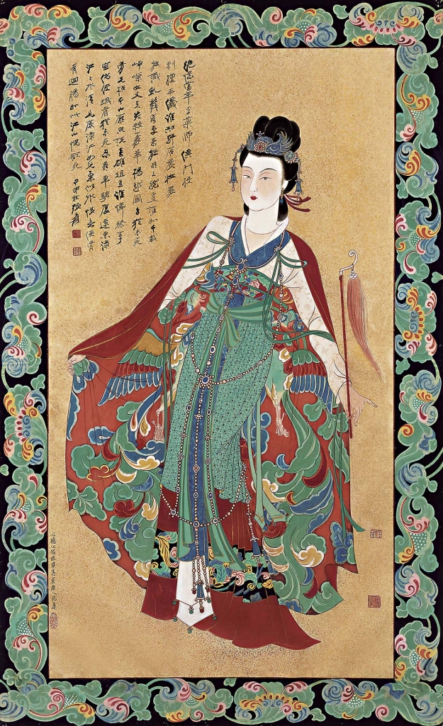 本幅為大千至敦煌潛修後所作,堪其平生腕底工筆仕女之最,是大千稽古敦煌、遙望盛唐精麗畫風的典範巨製。紅拂女出於《虯髯客傳》,該小說以隋末唐初為背景,故大千亦取法同時代的敦煌壁畫表現之,畫中聚焦單一人物,由面容、服飾、花紋、設色等皆可以看到敦煌風格菩薩像、供養人像的影響。如斗篷中的鳳鳥紋,正出自其臨摹敦煌壁畫之作;而裝潢花邊由大千兩個兒子心德、心智所繪製,造型與配色亦與大千臨摹敦煌的作品一致;畫中輪廓線皆至少經過二次勾勒,如人物肌膚是先勾墨線再迭紅線,衣帶、斗篷的花紋則先勾墨線再勾泥金等,讓物象更加立體與凸出,亦使畫面更富高古氣氛。大千曾於1949年〈仿唐人仕女〉自題:「敦煌歸後,其運筆及衣飾並效唐人,非時賢所能夢見也。」此件〈紅拂女〉驚才絕豔,當為大千盛唐面目輝煌之作。