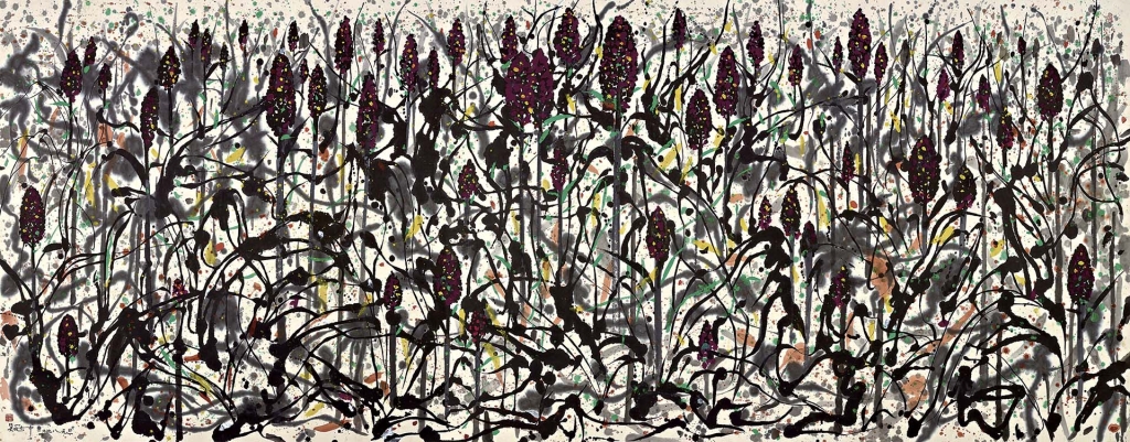 此作首度現身拍場,以高粱為主題,吳冠中曾於《吳冠中畫作誕生記》中解釋了高粱與自己在精神上的關聯性:「糧食是我的圖騰。南方的水稻和小麥個兒都矮,北國的高粱高高挺立,顯得風姿綽約,而且威武。下放勞動,種過各種莊稼,看高粱從幼苗而青春。滿身蒼翠,秋,通體豔妝。赤紅的腦袋在藍天搖曳,實是一種驕傲。」此件畫作寓抽象於具象中,穩定的垂線和躍動的曲線和諧交錯,殷紅和翠綠及墨線濃淡相映成趣,灰色在畫面中的分量縮小,色彩與黑滿屏交鋒,豔黑化身為肆意的墨蛇,與在畫面中的紅、黃、綠三原色形成既對立又統一的美感。