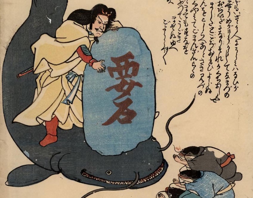除了官方記載的地震與可能祭拜的神明,日本民間各地有關地震的神話傳說亦相當發達。一般人最熟悉的,莫過於鯰魚引發地震的說法。特別是1855年發生安政大地震之後(圖6),出現很多以巨大鯰魚比喻地震的「鯰繪」圖像(圖7),成為研究者的討論重點。古人無從索賠,也無法讓震災中喪失的生命復生,所以把地震化為特定的具體形象,試圖祭拜或威鎮。江戶時期日本人便是把地震化身鯰魚,發展出許多平息地震的圖像,比如藉上古傳說時期的武神,以「要石」鎮壓鯰魚(圖8),不讓牠再移動導致大震,從現在留存的諸多浮世繪,可知「鯰魚=地震」已然成為19世紀中葉日本人深刻的圖像記憶。不過根據學者的研究,地震是由地底的大魚所引發的說法,在中南半島、中國等地都有類似的故事情節,可以說是某種區域共通的觀點。