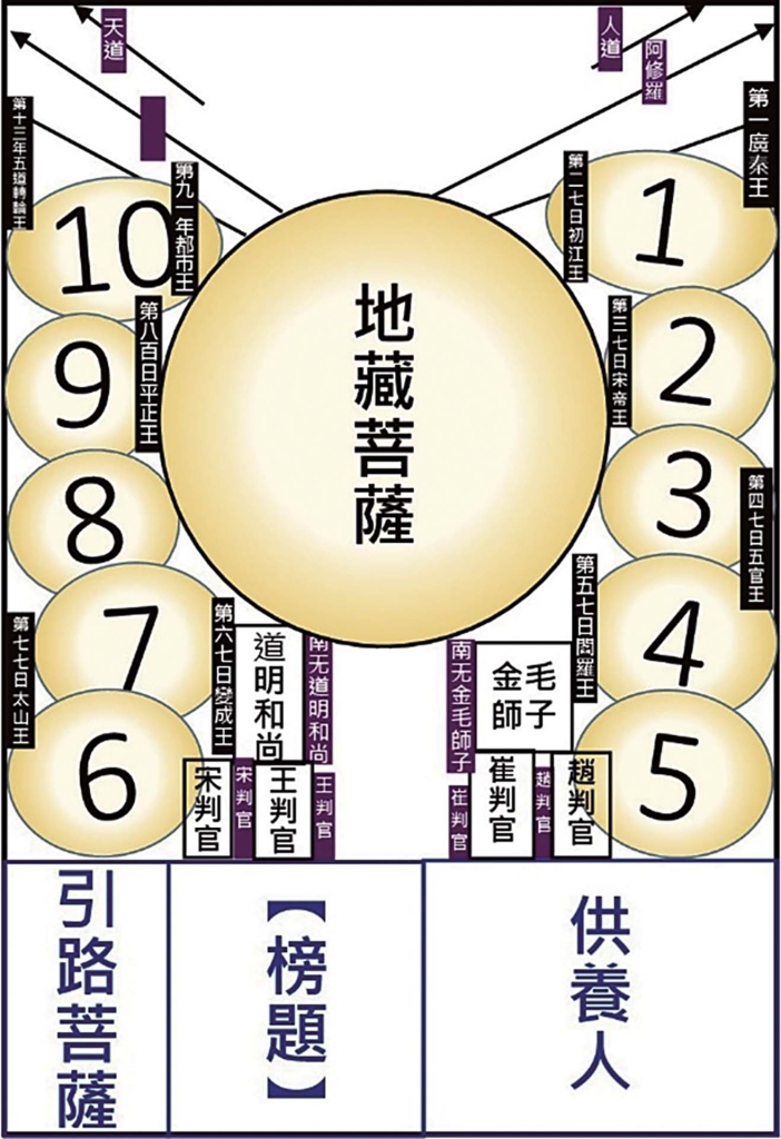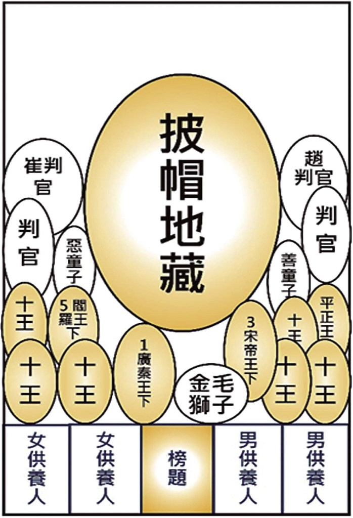 此圖畫面中央一張大供桌,供桌之上是十一面觀音和披帽地藏並置;供桌之下是道明和尚(仰頭望著雙主尊)和金毛獅子。再下方則是幽冥界的十王,此幅雖已搭配十王,但披帽地藏尚未獨當一面。