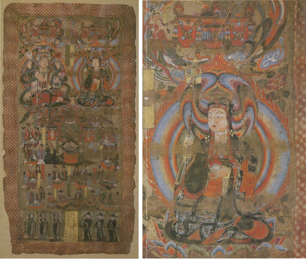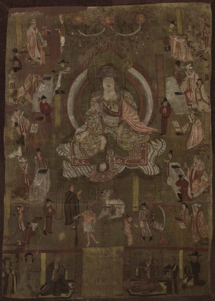 這點可從另一幅〈法藏EO.1173千手千眼觀音與披帽地藏十王圖〉(圖10、11)理解。此圖由上方「千手千眼觀音」與下方「披帽地藏」兩部分綴合而成,下圖披帽地藏主尊居中,兩側判官與十王、金毛獅子環繞,底下供養人,構圖十分完整(圖12)。事實上兩圖各自都有邊界裝飾框,獨立成圖都沒有問題。那麼,合在一起就是前述A類雙主尊、分開即B類披帽地藏為單獨主尊,在披帽地藏發展過程中,這兩種都是供養人出資可選擇繪製的型態,可見發展時間點可能是重疊的。