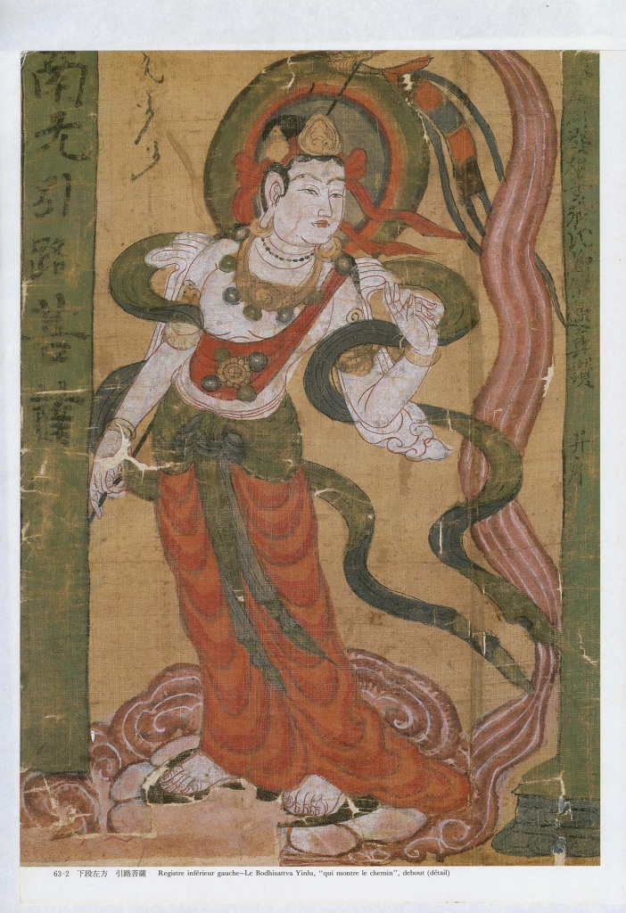 值得注意的是,畫面下方主榜題兩側,一邊是供養人所特定要求繪製的亡者、一邊是引路菩薩(圖18,榜題:「南无引路菩薩」),全圖的繪製意涵鮮明:祈請引路菩薩帶領亡者至披帽地藏坐鎮幽冥界,在通過十王審判考核時能安然過關。