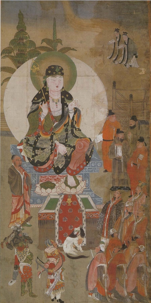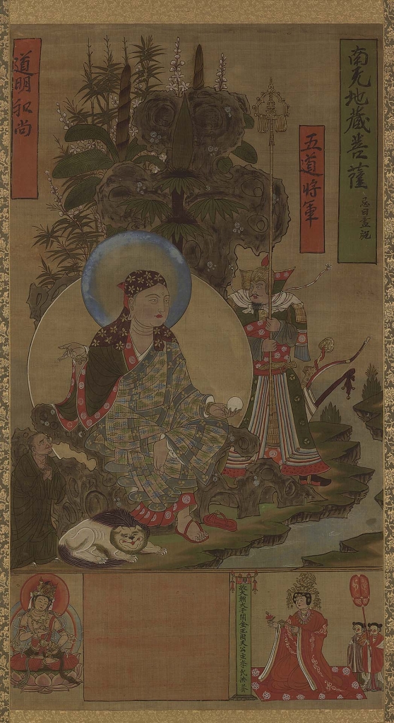 這一幅由上下兩部分組合:上方是淨土三尊像,下方則是披帽地藏的世界。地藏後方是六道輪迴,座下緊鄰道明和尚和金毛獅子,兩側布滿十王。值得注意的是,畫面雖分上下兩部分,顯然下方披帽地藏更是畫面的中心,全圖寓意著通過下方披帽地藏的護佑,眾生得以上升至佛國淨土。此圖中地藏的「披帽」,更強調耳際寬大的綁帶固定。而左手所持的「寶珠」並無火焰,是單純的白色裸珠。