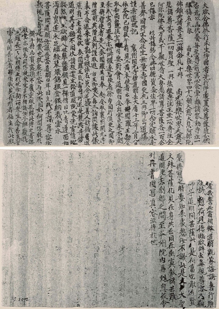 1900年(清光緒二十六年)6月22日,甘肅敦煌莫高窟隱藏於16窟牆壁內的第17窟「藏經洞」意外被發現,發掘出公元4至11世紀佛經、社會文書、各種文物等超過五萬件。清末各國掠奪盜寶,敦煌寶藏流散四處,而斯坦因第一位進入藏經洞將大量精美敦煌遺書運回英國,今收藏於大英圖書館。其中編號S.3092〈道明和尚還魂記〉(圖1)記錄了一段來自幽冥界的靈異消息。