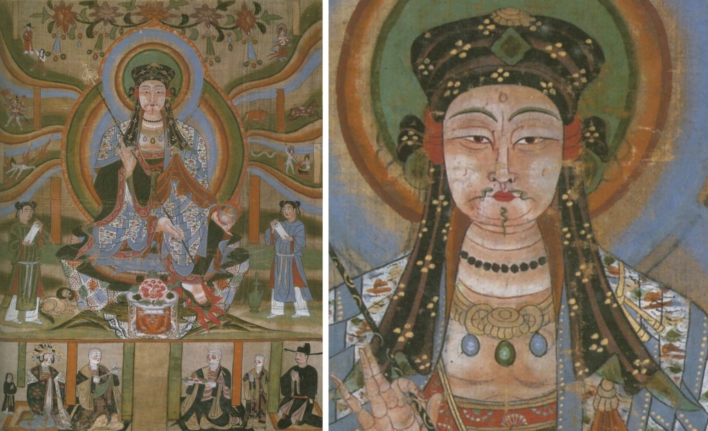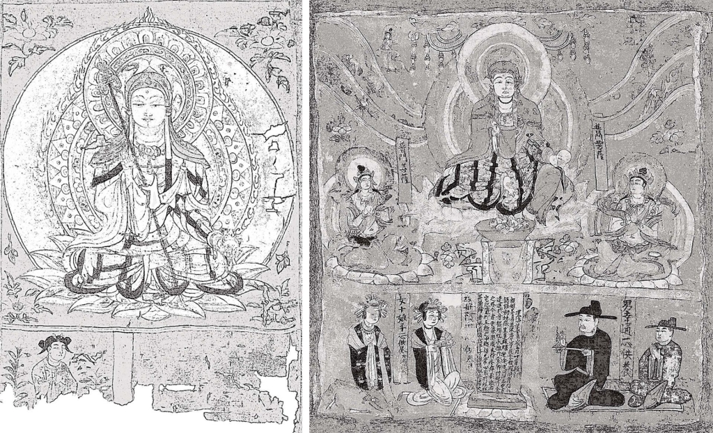 有意思的是:此英藏SP.19留有珍貴「北宋建隆四年」(963)紀年,此時間點,比之於前述B類〈法藏MG.17659千手千眼觀音菩薩圖〉(見圖2、圖3)「北宋太平興國六年」(981)紀年,在時間上其實還更早。筆者認為,這些現象剛好反映出:披帽地藏與其他主尊搭配或成為單一主尊,並非完全是B模式取代A模式,顯示仍處於多元嘗試的階段,而非定式。