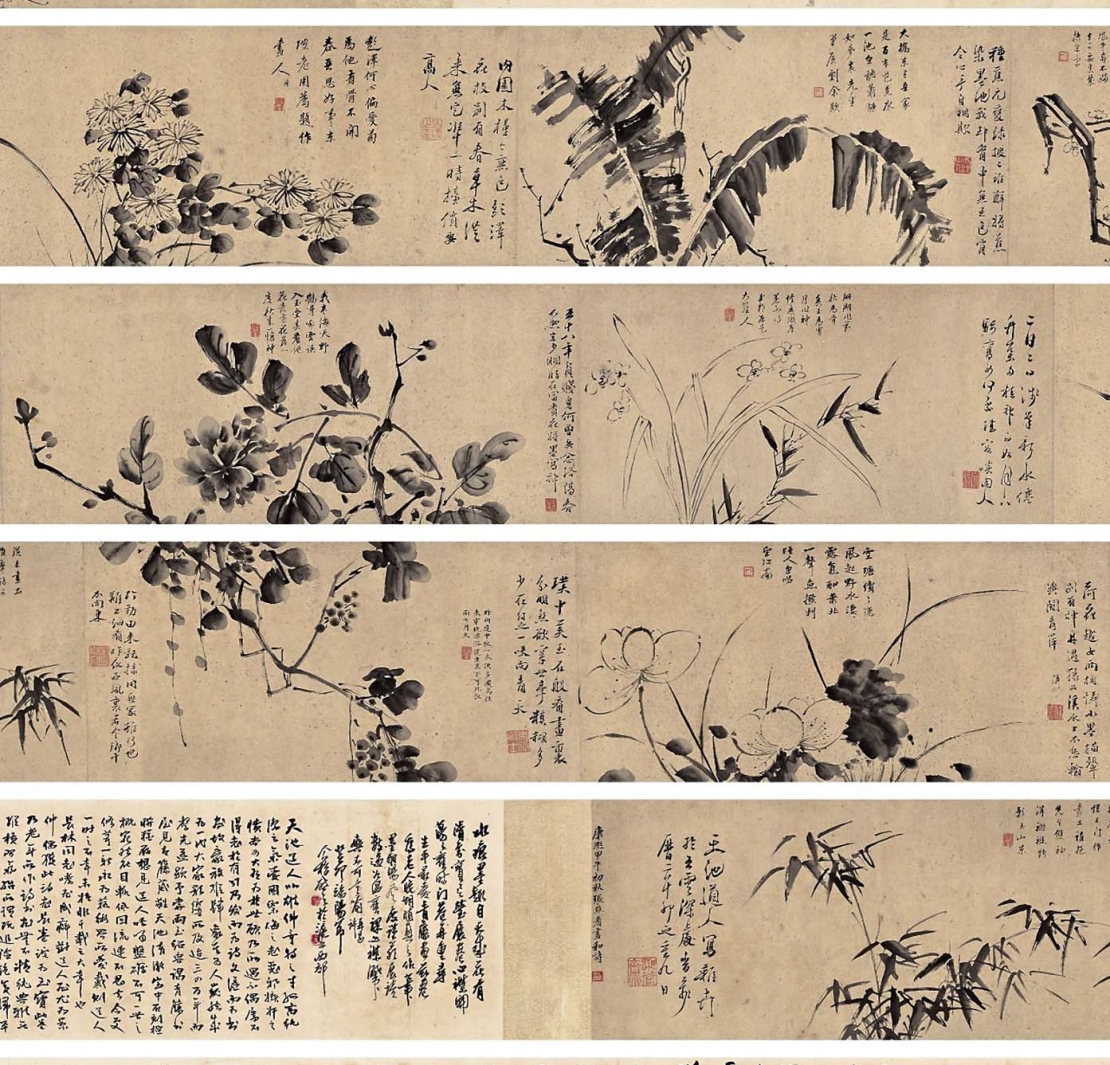 徐渭,初字文清,後改字文長,號青藤道士、天池山人、田水月等,八次鄉試都以失敗收場,但因出色的才華成為胡宗憲的幕僚,然至中年出現精神失常,曾有自殺未遂的狀況,隔年又以殺妻入獄。出獄之後,他以變賣書籍、題寫詩文書畫維生,晚年處境淒涼。戲劇化的人生歷程及卓越的繪畫天分,引起後世的好奇和喜愛。〈墨花八段卷〉為濟南文物商店舊藏,卷長近八公尺,描繪八種花草植物,這類構圖受到明代吳門畫派的影響,延續了陳淳、陸治、周之冕等明代畫家的四時雜花長卷樣式,採水墨寫意的風格。今北京故宮博物院藏有徐渭1592年作的花卉長卷〈墨花九段圖〉,與此卷兩相對照,頗有異曲同工之妙。每段都有畫家自題七言詩,乾隆年間的名臣張照也寫下九次題跋和賦詩八首。卷前則有王伯敏題引首,卷後有王个簃、俞劍華、潘天壽、謝稚柳四位名家題跋,潘天壽更將本卷視為畫家標準件並曾臨摹過。全卷的章款保存完好,出版和展覽記錄總計36個。〈墨花八段卷〉曾在2021年西泠春拍現身,成交價人民幣2932萬5000元。2024年西泠印社再度拍賣此花卉卷,成交價落在人民幣2990萬元。