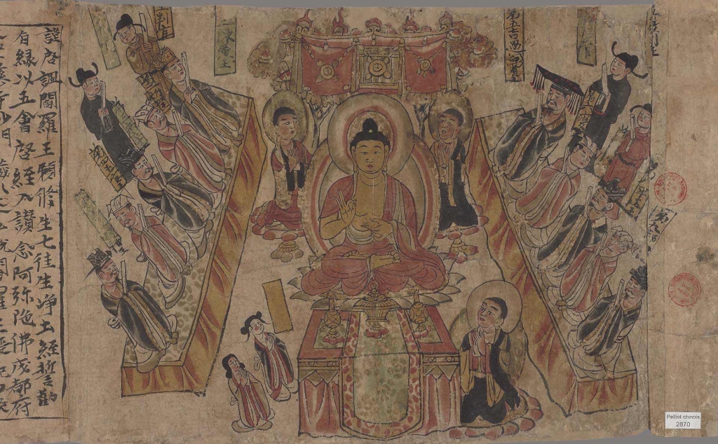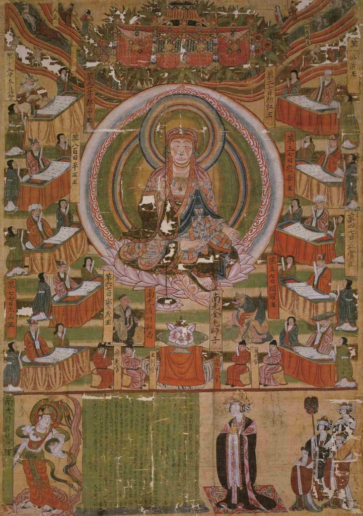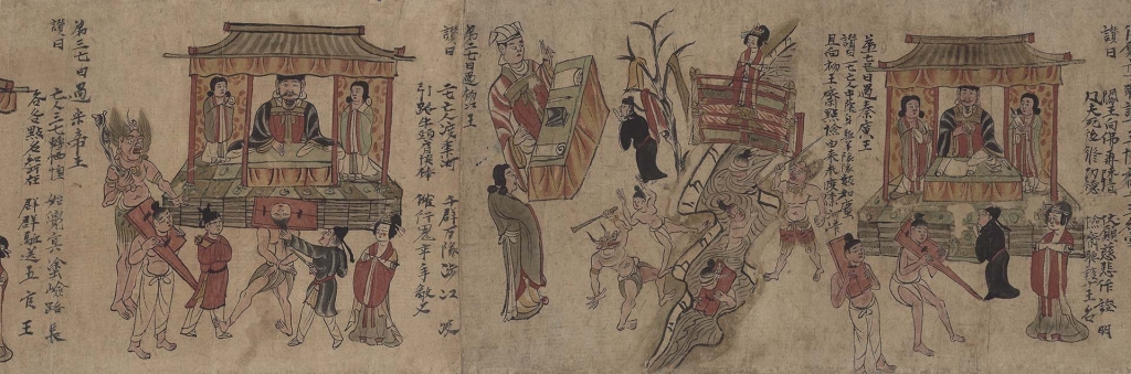 目前可以看到最早的「地獄十王」圖像,幾乎都出於敦煌藏經洞所出土的卷軸,其淵源皆出於唐代出現的偽經《十王經》(全名為《佛說閻羅王授記四眾預修生七往生淨土經》)。以法國伯希和(Paul Pelliot)所收集,今日藏於法國國家圖書館的經卷為例(圖5),卷軸開頭之處,有佛陀坐於中央,「地獄十王」列坐兩側。隨後畫面中有位使者,一旁經文描述其形象:「我等諸王,皆當發使,乘黑馬,把黑幡,著黑衣,檢亡人家」,隨後以「異地同時」的描繪方式,闡述使者領死者接受一次次的審判之過程。此時可以看到一位身穿華服的女性,手捧經卷,相較於其他赤身裸體、頸戴枷鎖、遭到鬼卒笞打的其他人,顯得從容不迫,免遭苦難。此即是《十王經》中所說:「若復有人,終造此經,受持讀誦,捨命之後,不生三塗,不入一切諸大地獄。⋯⋯若造此經,及諸尊像,記在冥案,身到之日,閻王歡喜,判放其人,生富貴家,免其罪過。」畫面中的女子,即反映經文所講,因為攜帶《十王經》,所以每次審判都能得到赦免,並且順利轉世投胎到更好的人家。