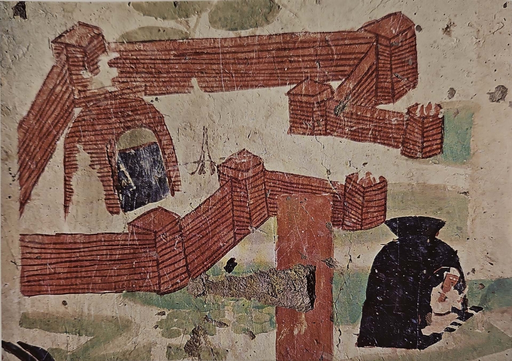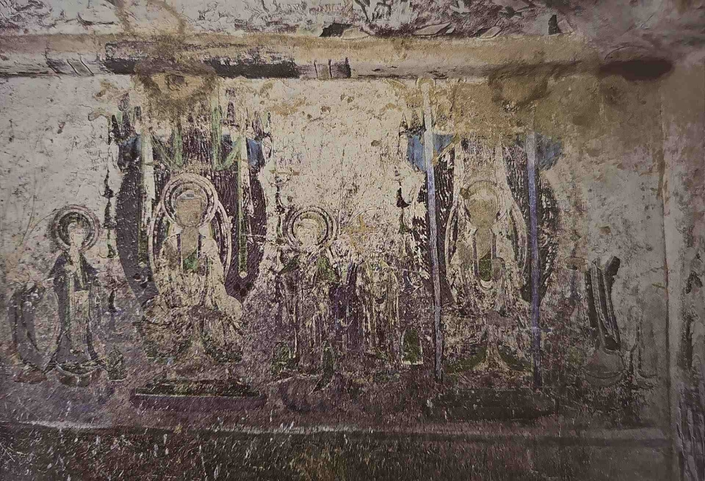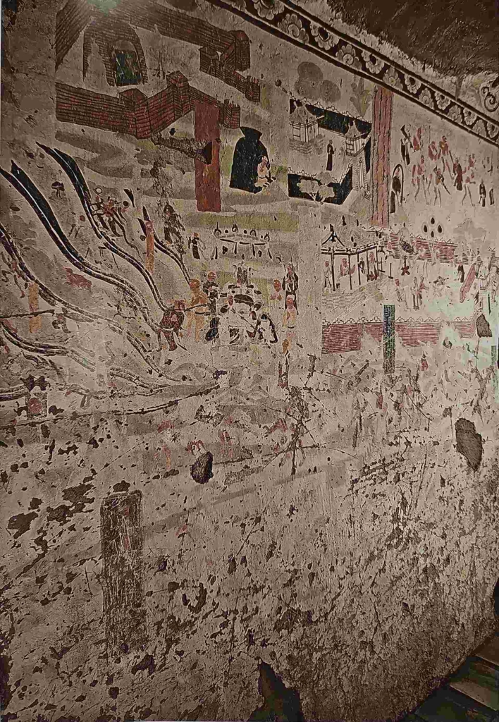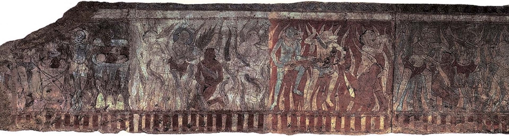 早期的佛教圖像中,描繪地獄較為少見,即便有,也不是主要的內容,多半屬於經變圖的一部分。比如位於甘肅省的麥積山石窟第127窟,此窟開鑿於北魏(386-535),在洞窟內的四面牆壁與天花板,保存相當多的壁畫內容。其中南壁由出入的門洞分為左、右、上方三部分,甬道左側描繪「十惡圖」,甬道右側描繪「十善圖」,上方描繪「七佛圖」(圖1)。遺憾的是,因為牆面遭到燻黑,內容辨識困難,甬道右側的圖像(圖2),可以勉強看出有一個中國式的建築院落,院落中有一個明堂式的建築,隱約可見許多人在其中,中間正坐一人,被認為是閻羅王在進行審判。在畫面當中,有一些文字說明,如「此人行十善得參道時」的內容。左側的圖像也模糊難以辨識,但在當中也有文字描述,可以分辨出有「⋯⋯當墮刀山地獄」、「⋯⋯令入截臂地獄」等內容,知道這部分的圖像應該是描繪地獄景象。