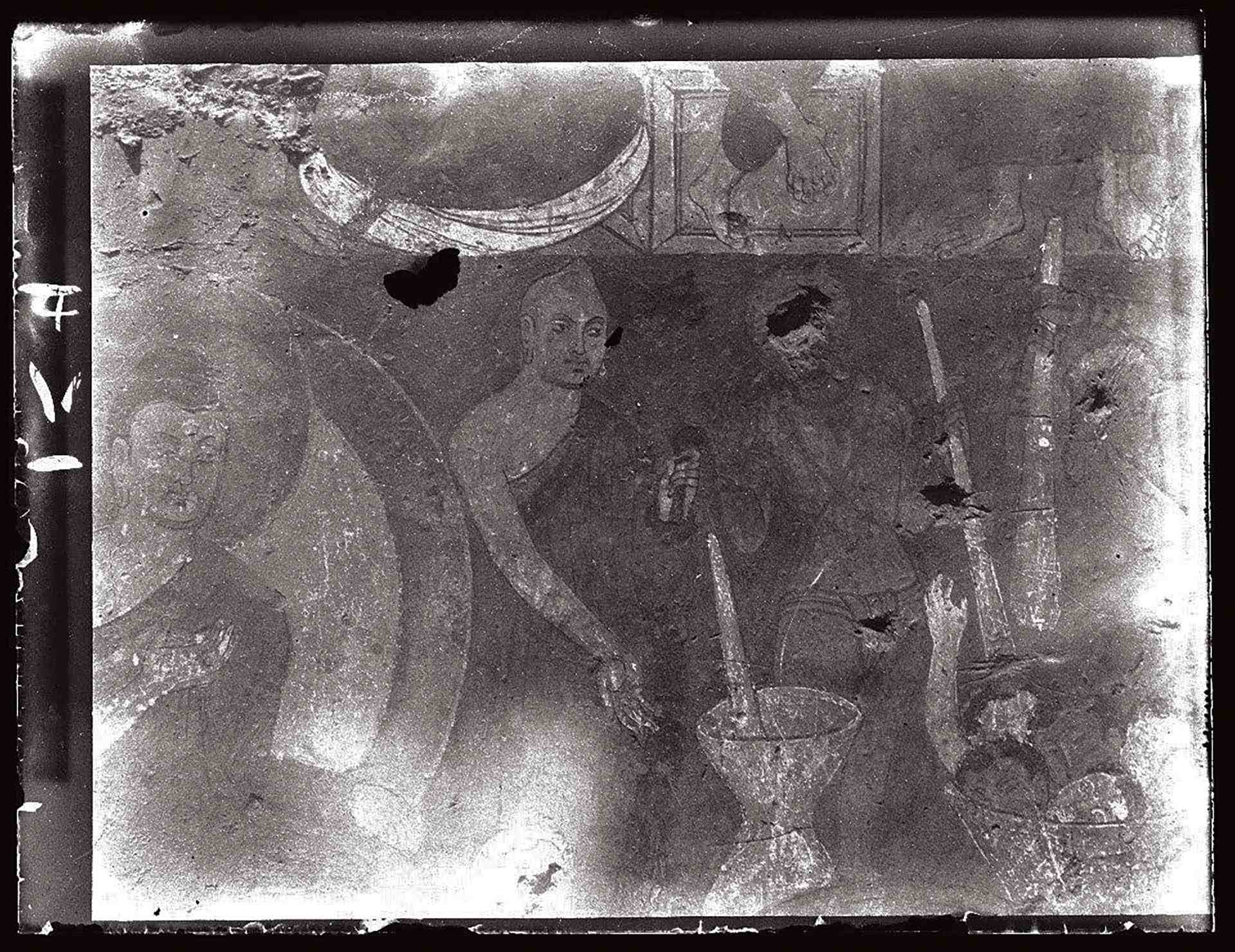 新疆一帶留存的佛教石窟中,也可見到描繪地獄的圖像。像是德國探險家李寇克(Albert von Le Coq)所帶走的新疆克孜爾石窟壁畫,當中的魔鬼窟(199窟)中留存一條帶狀的壁畫,描繪出地獄的場景(圖3)。根據研究,描繪的時間大約在6世紀。長條狀畫面根據顏色分為數個塊面,但背景可以看到一連串尖尖的圖樣,表現出地獄的熊熊大火,在地獄受苦的人遭到獸手人身的鬼卒拷打施虐,最左側已有部分殘軀的圖像中,甚至可以看到有大釜放在火上,當中擠滿了人頭。類似的地獄描繪,在日本大谷探險隊所拍攝到的新疆石窟壁畫照片中也曾見到(圖4),遺憾的是,照片裡的壁畫今日已經不存。從照片所見到的壁畫遺存,可以看到與克孜爾石窟類似風格的描繪手法,跟麥積山石窟所看到的有明顯差異,可以看到早期地獄圖像在表現上的多樣性。