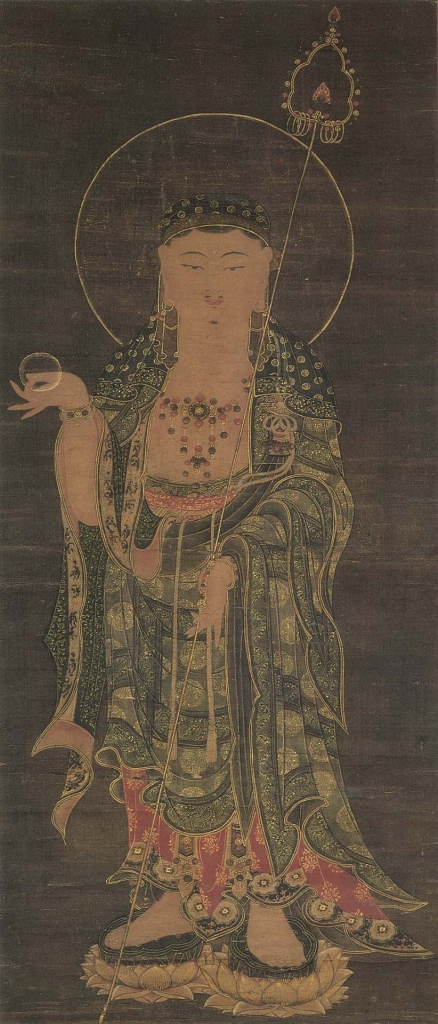 伴隨地藏菩薩救度地獄眾生的概念日益普及,相應的圖像也隨之出現。敦煌出土多鋪「披帽地藏圖」,當中即有與「地獄十王」組合的圖像(註2)。敦煌石窟壁畫或出土絹畫中的「披帽地藏」,最大特色就是身穿袈裟,且頭戴披巾,彷彿戴著一頂帽子。披帽地藏有時單獨出現,有時伴隨「地獄十王」,比如法國吉美博物館收藏的「披帽地藏十王圖」(圖7),畫面可以粗略地分為上下兩部分。上面占據畫面比重較多,可見中央處為地藏菩薩,頭戴披巾、身穿袈裟、手拿錫杖,左右兩側則分別羅列地藏十王,刻畫詳細,均坐在一張桌案之後,手中拿笏,下方則有金毛獅子(文殊菩薩化身)與道明和尚,畫面布局疏密有致,描繪工細。下面的部分則又可以分為左邊的引路菩薩、中間的願文、右邊的供養人。從右邊的供養人頭戴鳳簪、身穿華服,身後還有穿戴同樣華麗的隨從,可知這幅畫有地藏菩薩的十王圖,是為當時敦煌統治階層的女性所繪製。這種「披帽地藏」的形象甚至流傳至朝鮮半島,如日本根津美術館所藏14世紀高麗時期的地藏菩薩像(圖8),同樣是繪製成披帽形象。這類形象的地藏菩薩在高麗時期相當常見。