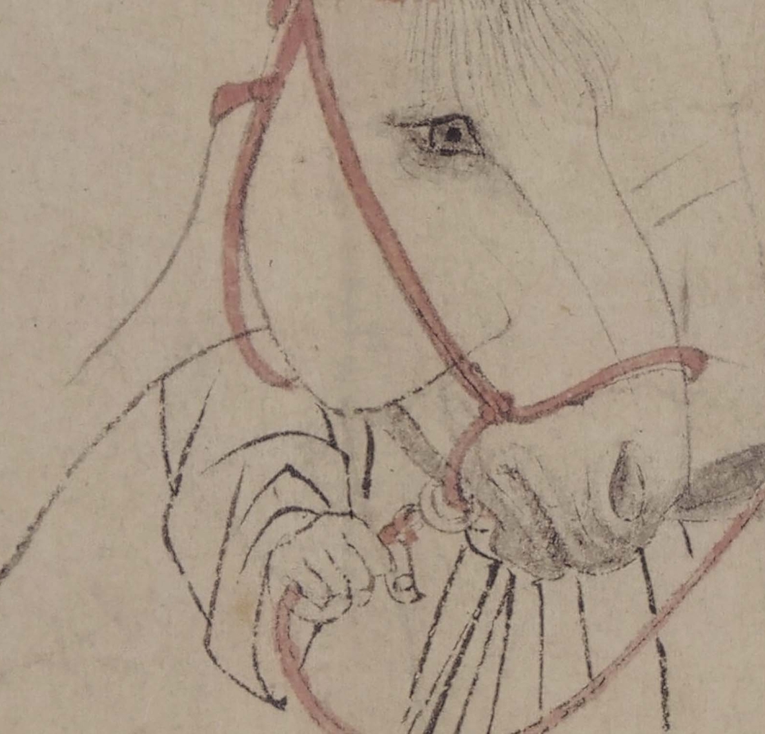 元代湯垕:「李伯時,宋人物第一,專師吳生,照映前古者也!畫馬師韓幹,不為著色,獨用澄心紙為之,惟臨摹古畫用絹素著色。」指出李公麟的馬畫,學習自韓幹(706-783),使用澄心堂紙,但不「著色」,臨摹古畫時使用絹素「著色」。在不依靠顏色的幫助下,李公麟透過用筆,將握繩的拳頭與衣袖處理得十分精準,讓觀者充分感受精準的畫意(圖12)。這些表現都有賴於筆鋒的精準運用才能達到,因為正偏峰本身就帶著圓扁的視覺效果,可藉此暗示觀者所描繪物象的樣態。